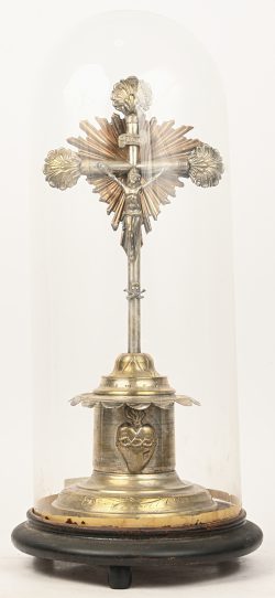 #117Een lot van vier antieke metalen voorwerpen, waaronder een kunstig bewerkte karaf, een sierlijke dekselpot, een verzilverde vaas en een gedetailleerd beeld van een haan.