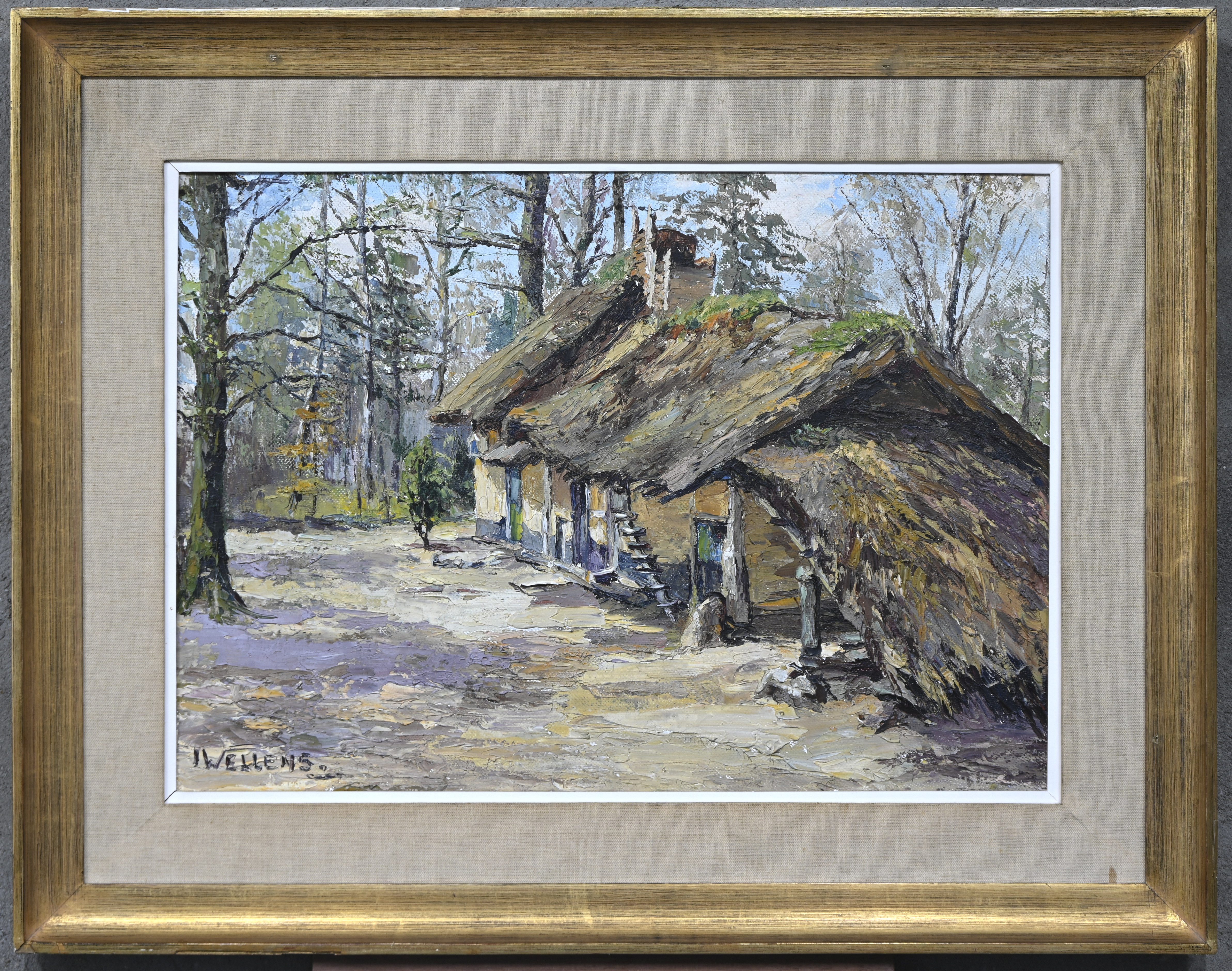 “A chalet in the woods,” an impasto oil painting on canvas. Signed I. Wellens.