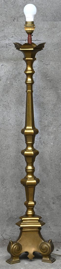 #284Een massieve messingen kerkkandelaar als lampvoet.