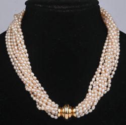 #30Een 10 rijen parelhalssnoer met 18 kt geelgouden slot.