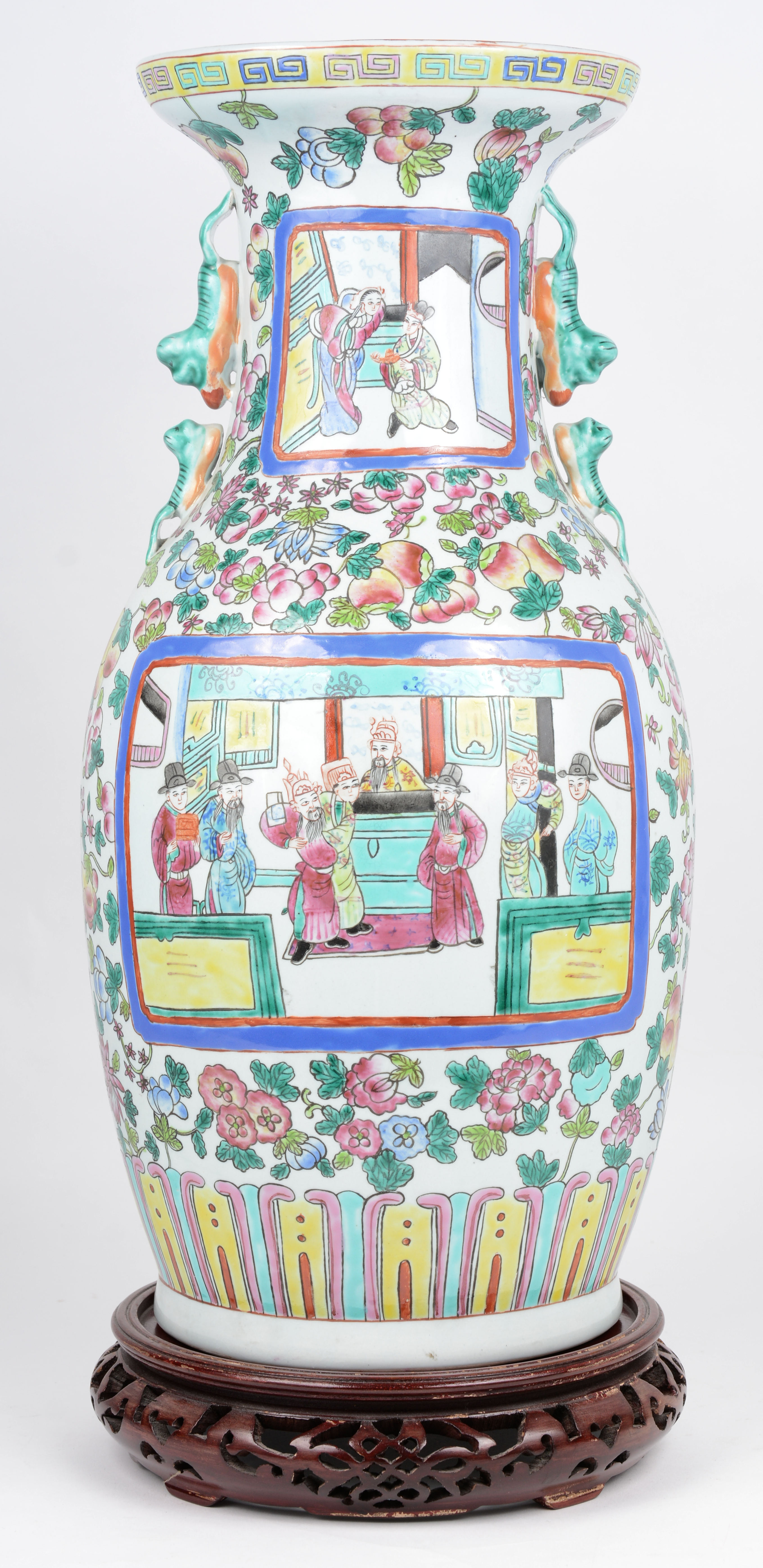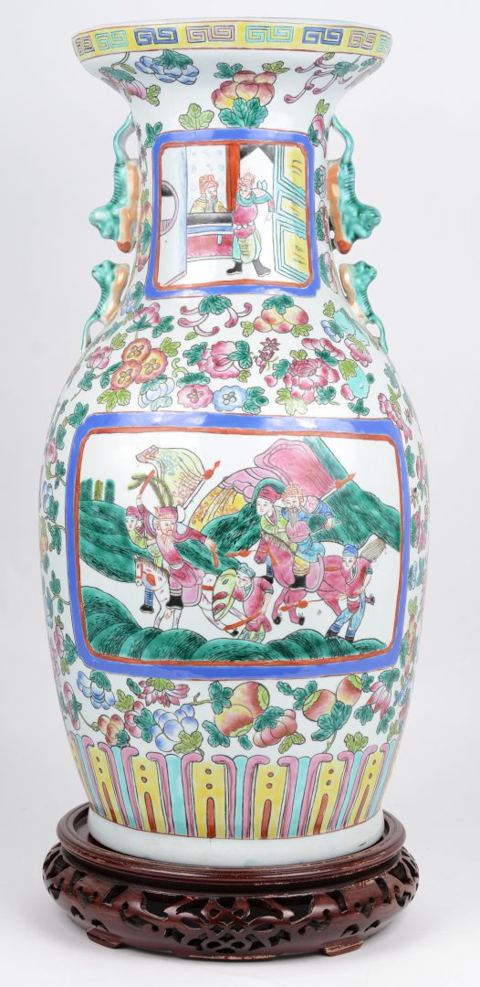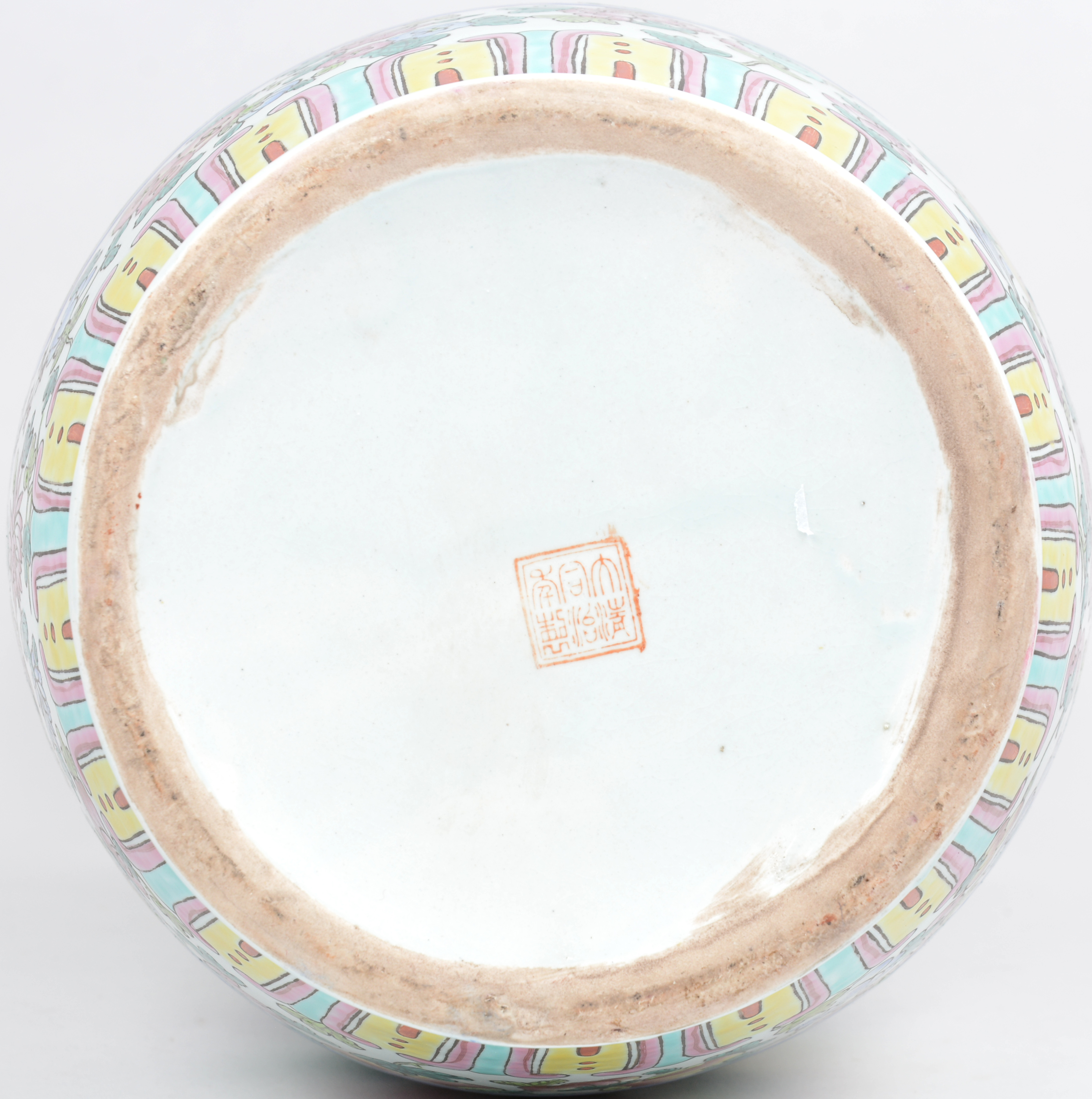 A pair of large tea canisters made of multicolored Chinese porcelain, famille verte. Decorated with blossoming branches. Marked at the bottom. -