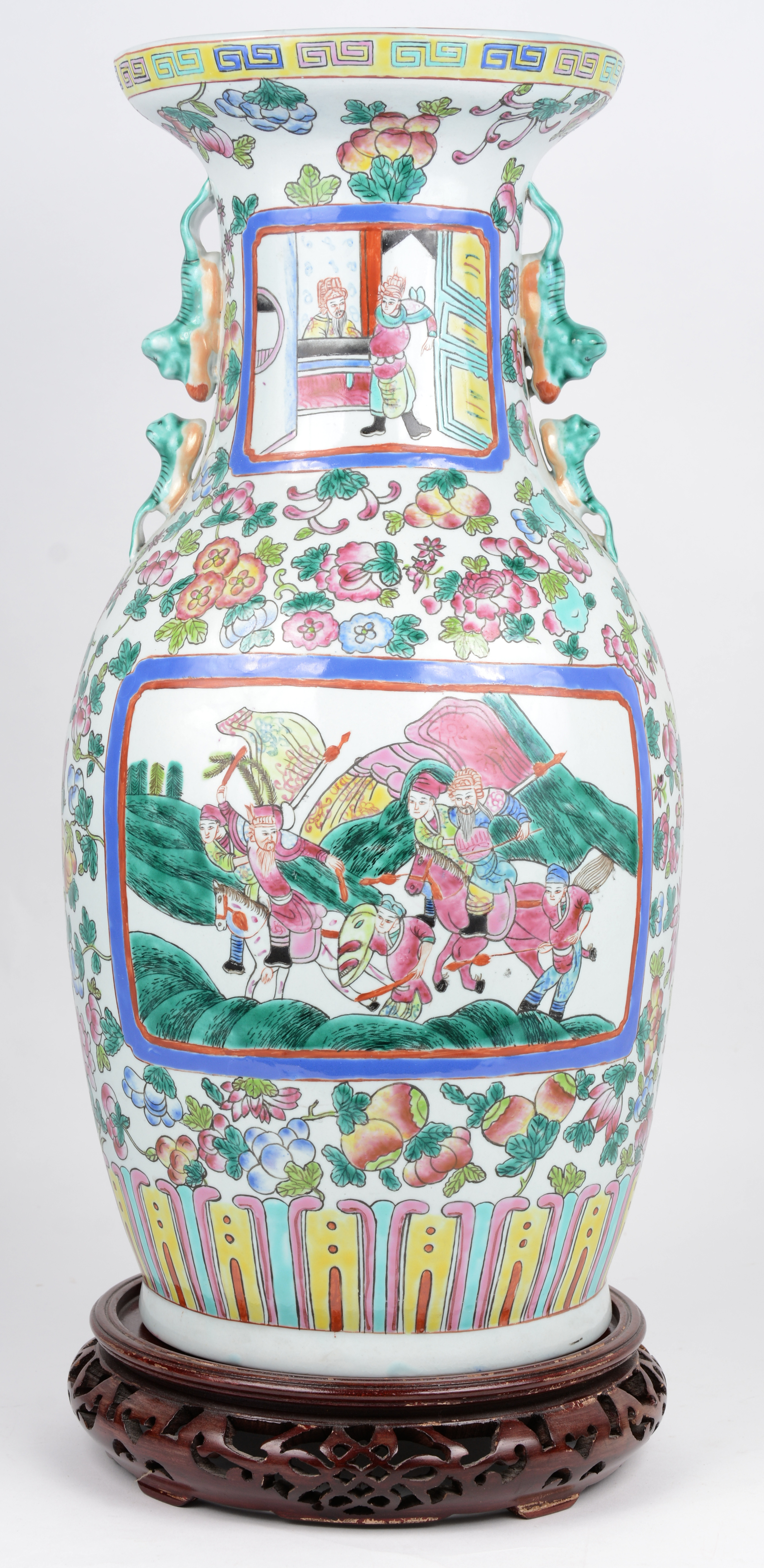 #417Een paar grote theebussen van meerkleurig Chinees porselein, famille verte. Met een decor van bloesemtakken. Onderaan gemerkt.