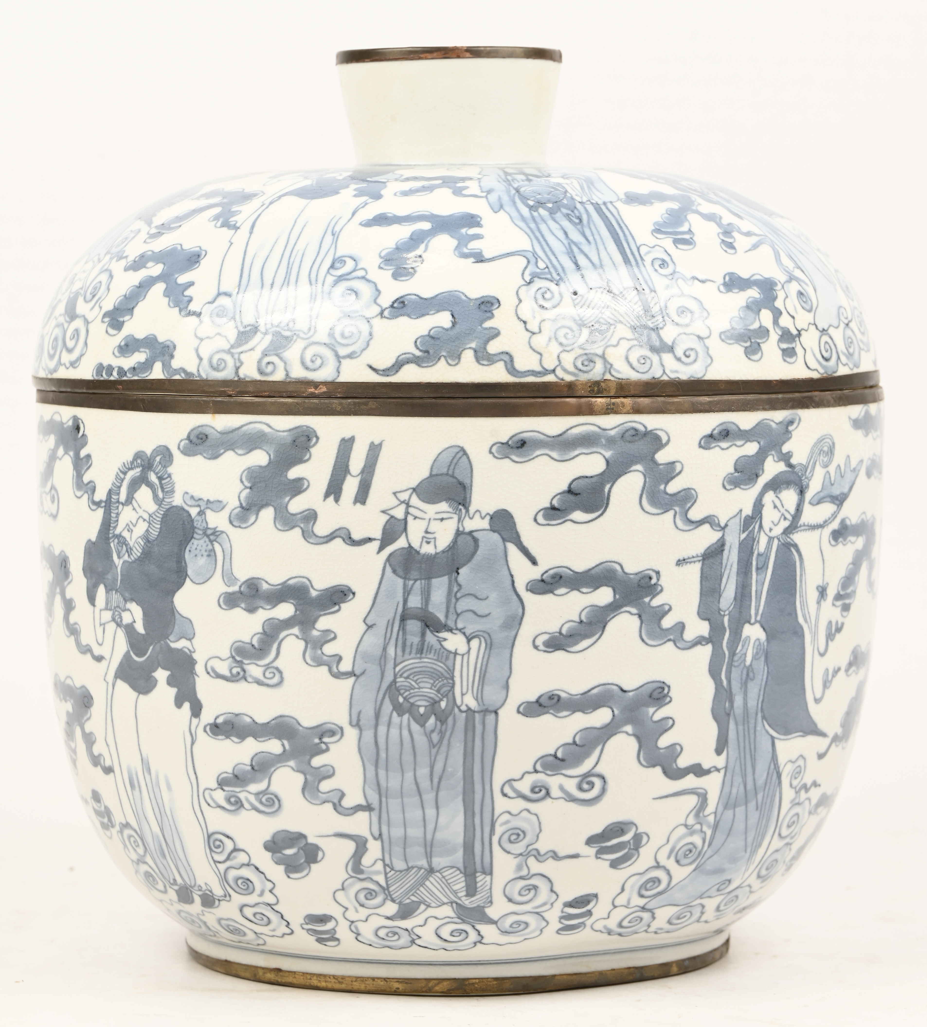 #104Een set van 2 Chineesporseleinen theebussen met figuren in het decor.