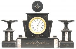 A three-piece set of black marble with engravings in the decor, consisting of a clock and two cassolettes in the shape of flat dishes. Late 19th century. -