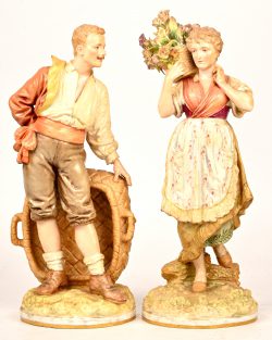 #153Een paar polychrome beeldjes van porselein en biscuit. Voorstelling van een vrouw met een bloemenmand en een man met een grote lege mand. Onderaan gemerkt, mogelijk Kiyelka, eerste kwart van de XXste eeuw. Minuscule herstelling aan een bloem.