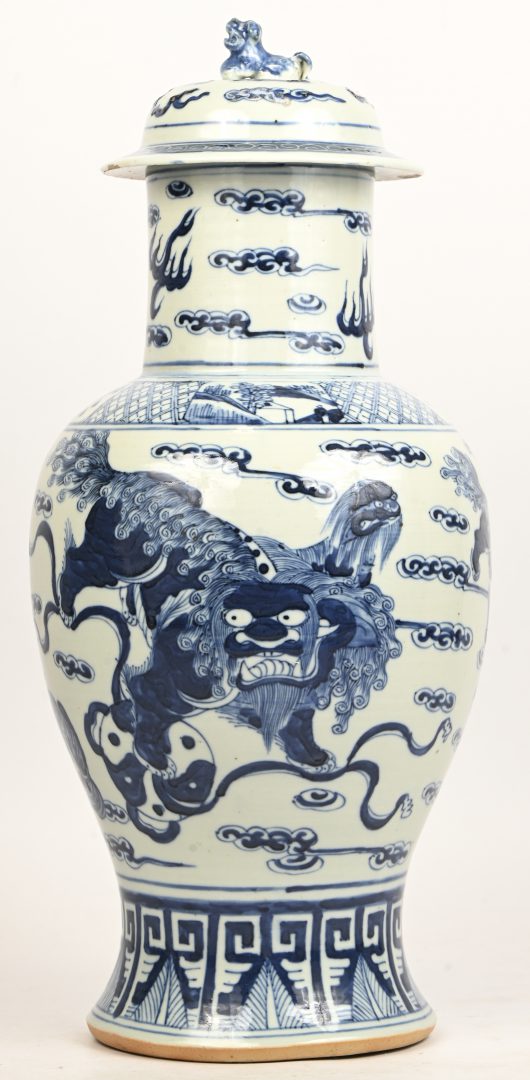 #433Een paar grote dekselvazen van blauw-wit geglazuurd Chinees aardewerk. Met een decor van draken.