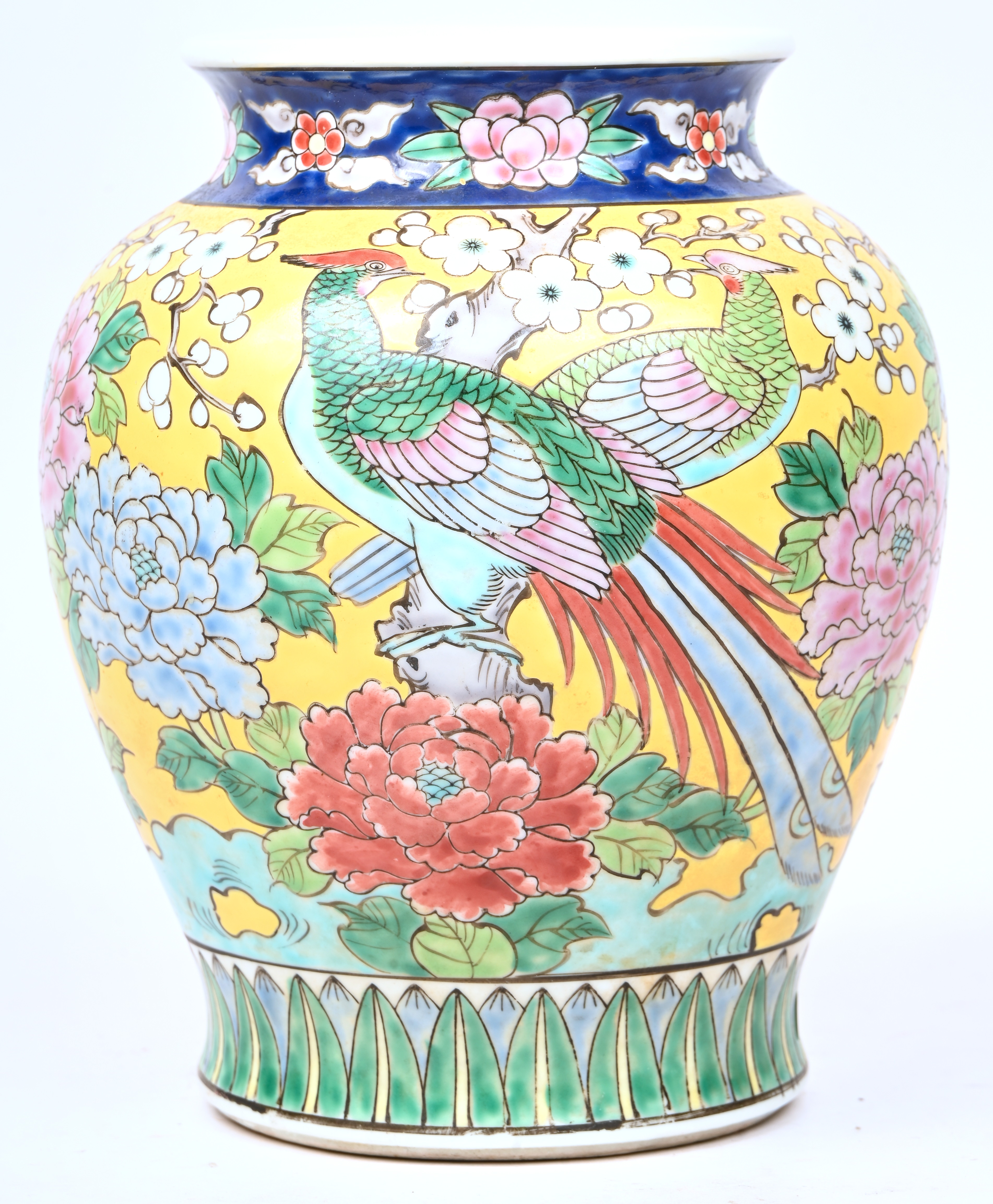 A collar vase made of multicolored Chinese porcelain, famille rose. Marked at the bottom. -