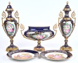 A cabinet set consisting of a bowl and two cassolettes made of cobalt blue porcelain. Included are two decorative plates marked DM, Limoges.