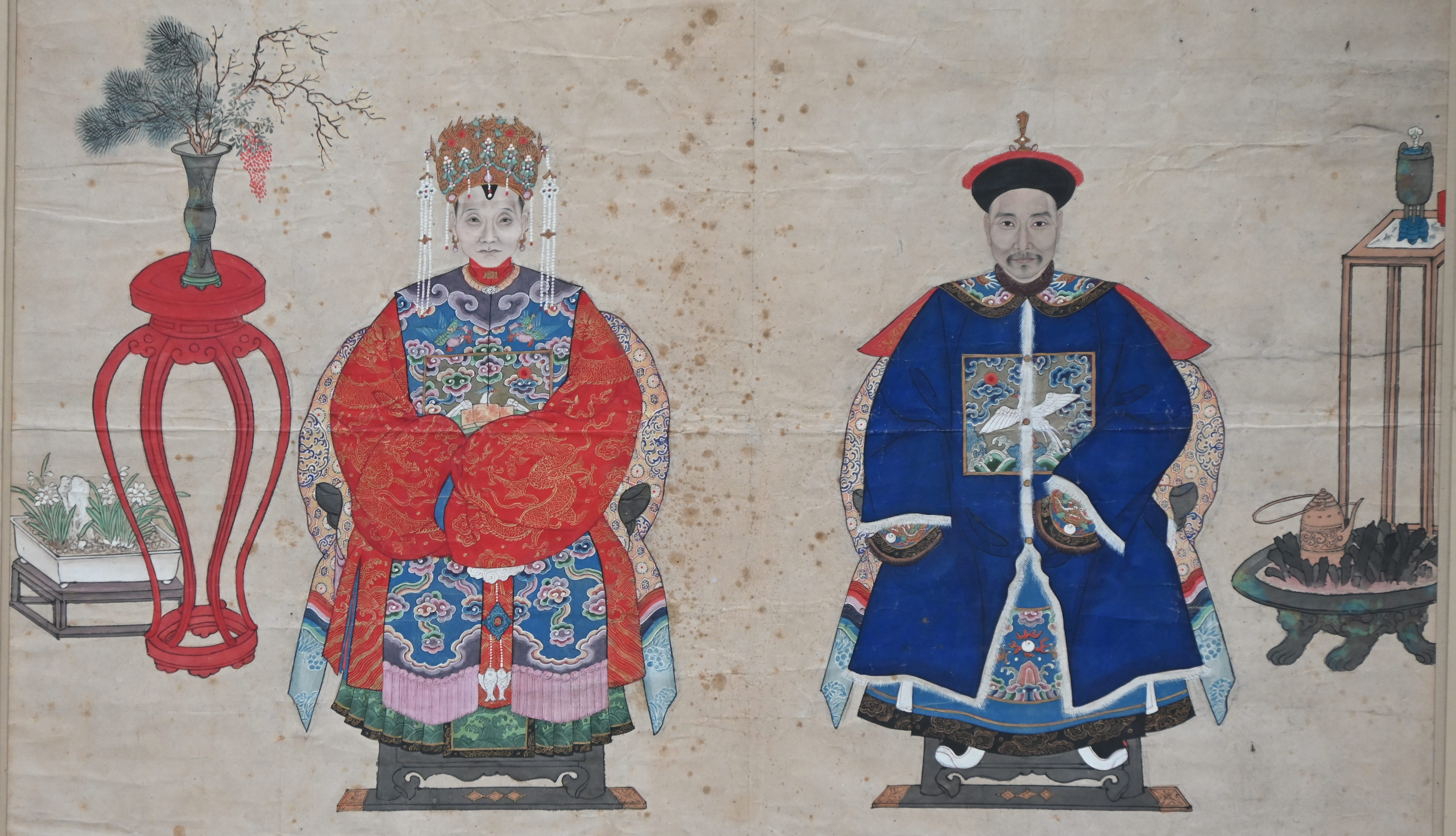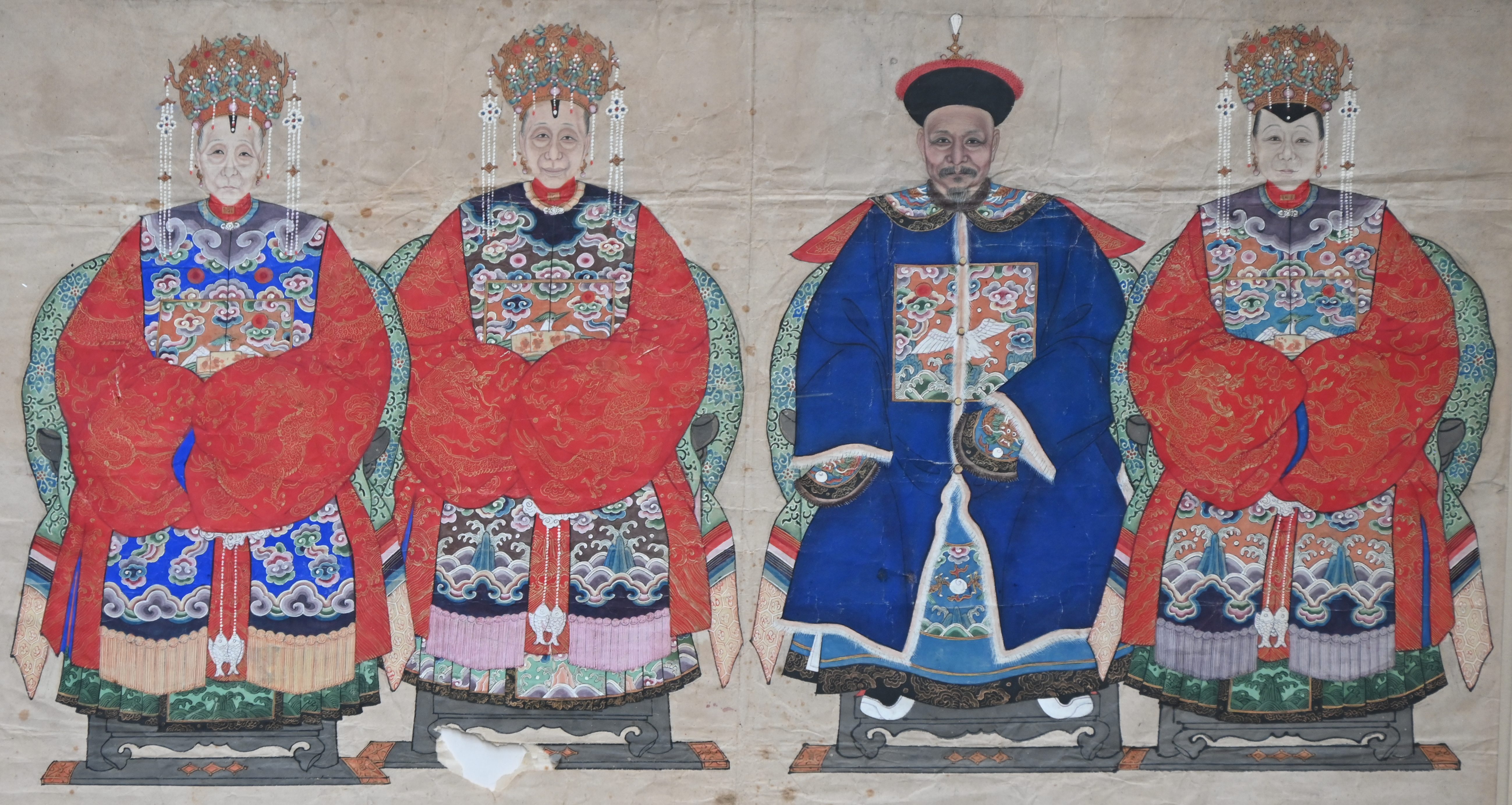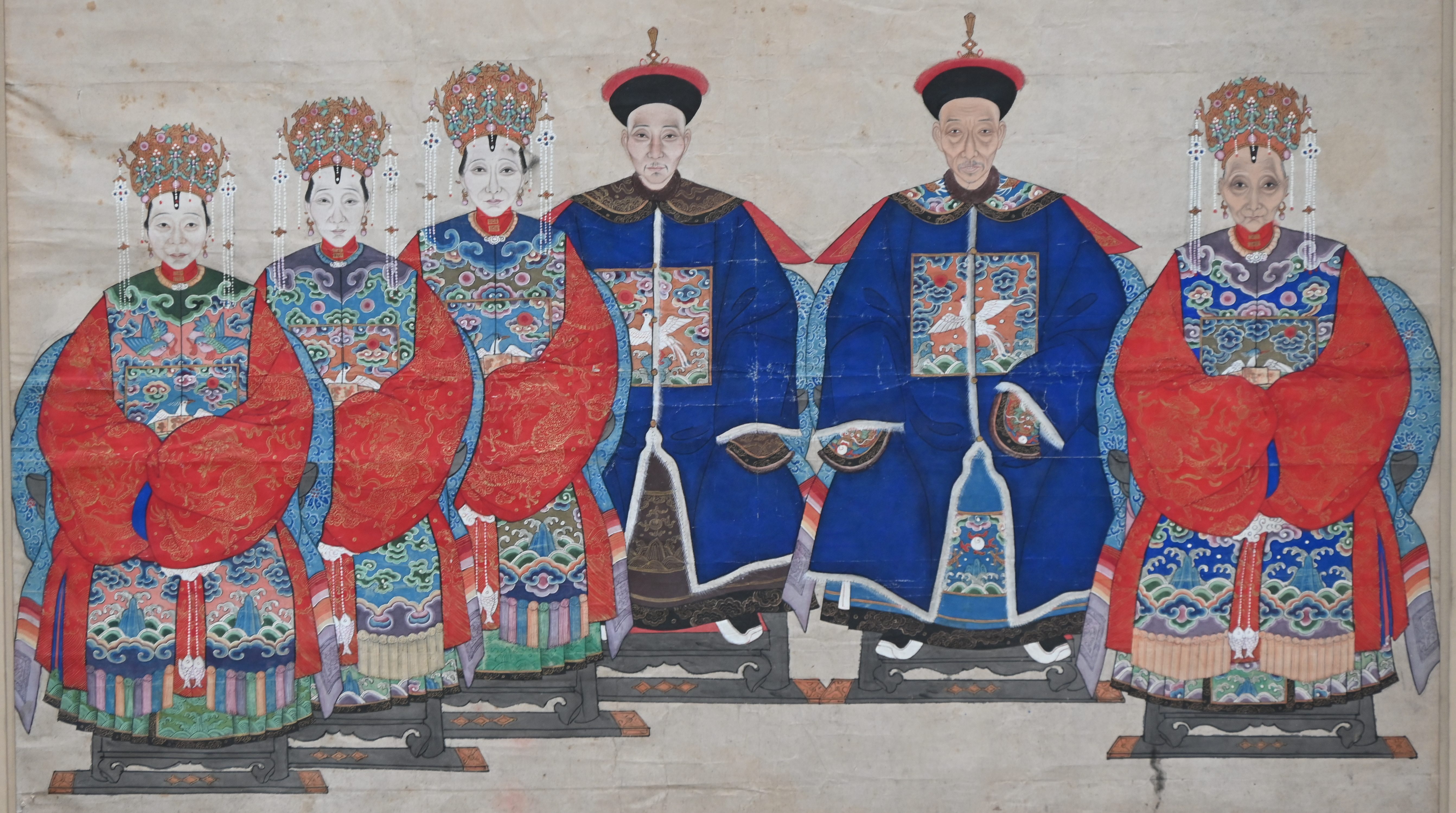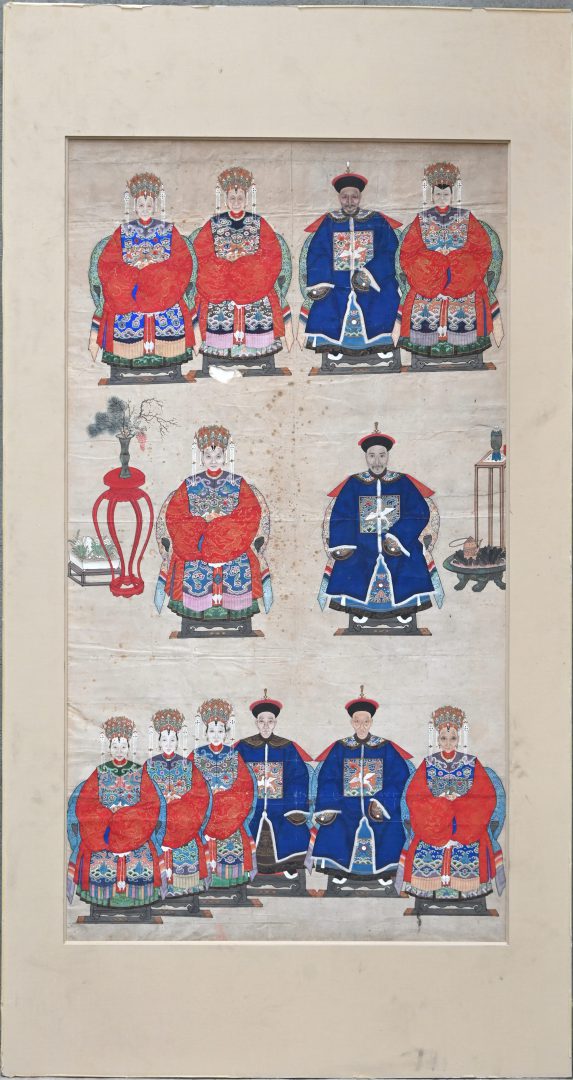 A Chinese ancestor portrait with 12 figures. With damage.