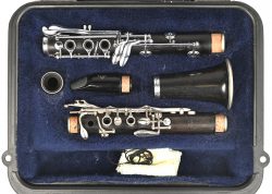 A Signet clarinet by the brand Selmer USA, in a plastic case.