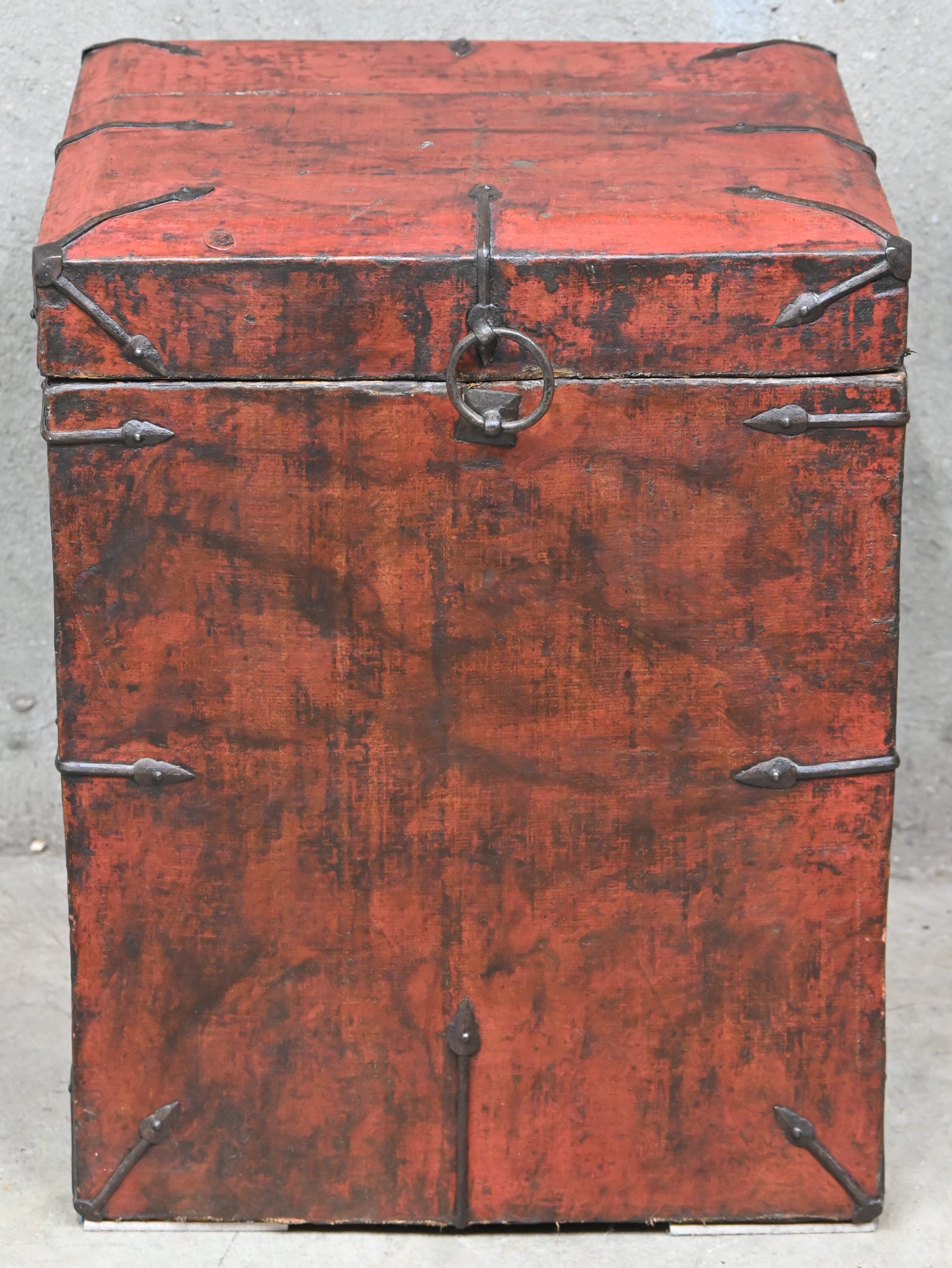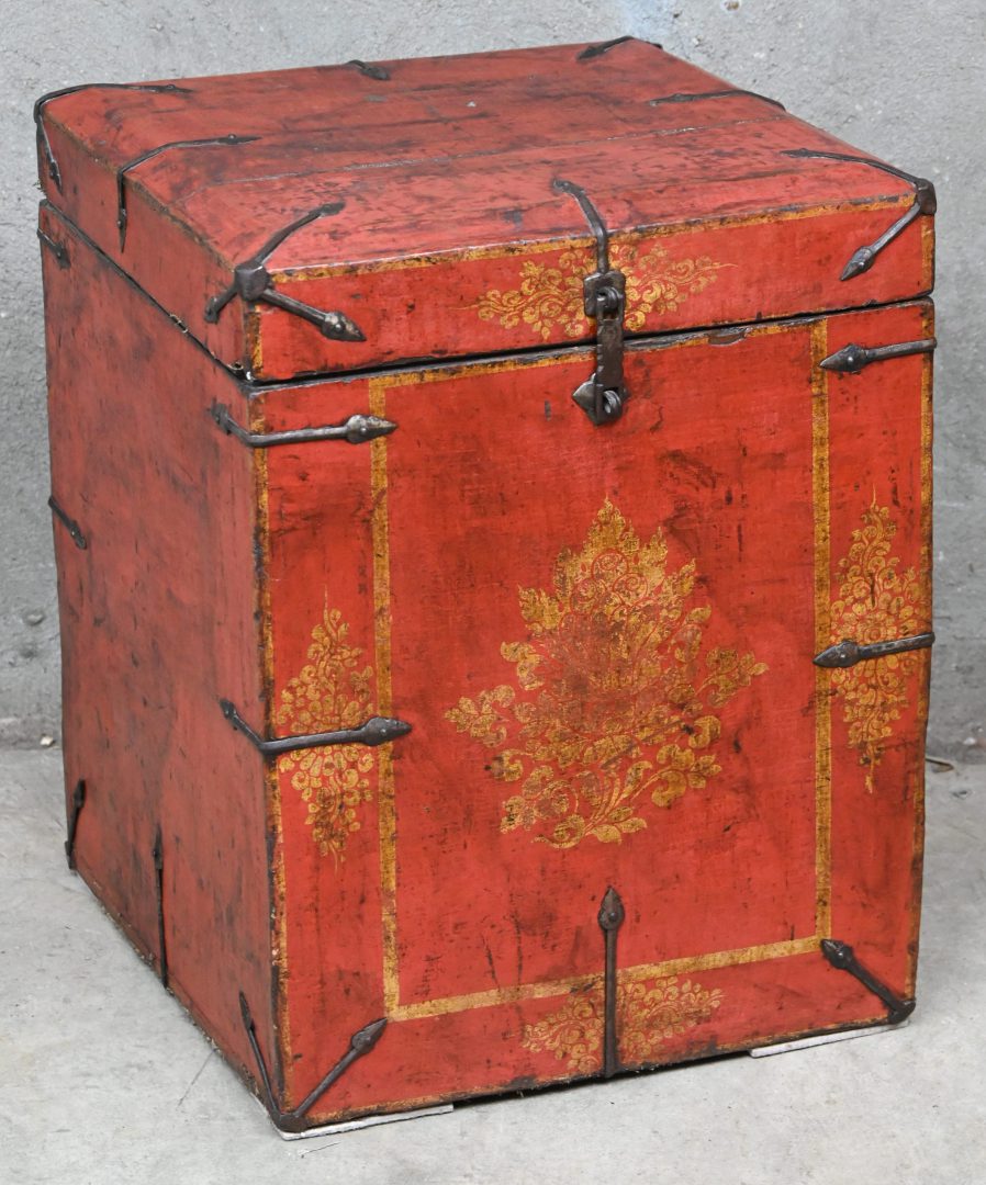 A Chinese wooden trunk, covered with painted fabric and metal fittings.