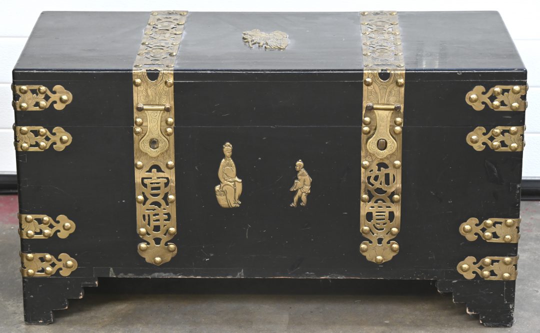 A Chinese trunk of black lacquered wood with brass mounts. One lock plate is incomplete.