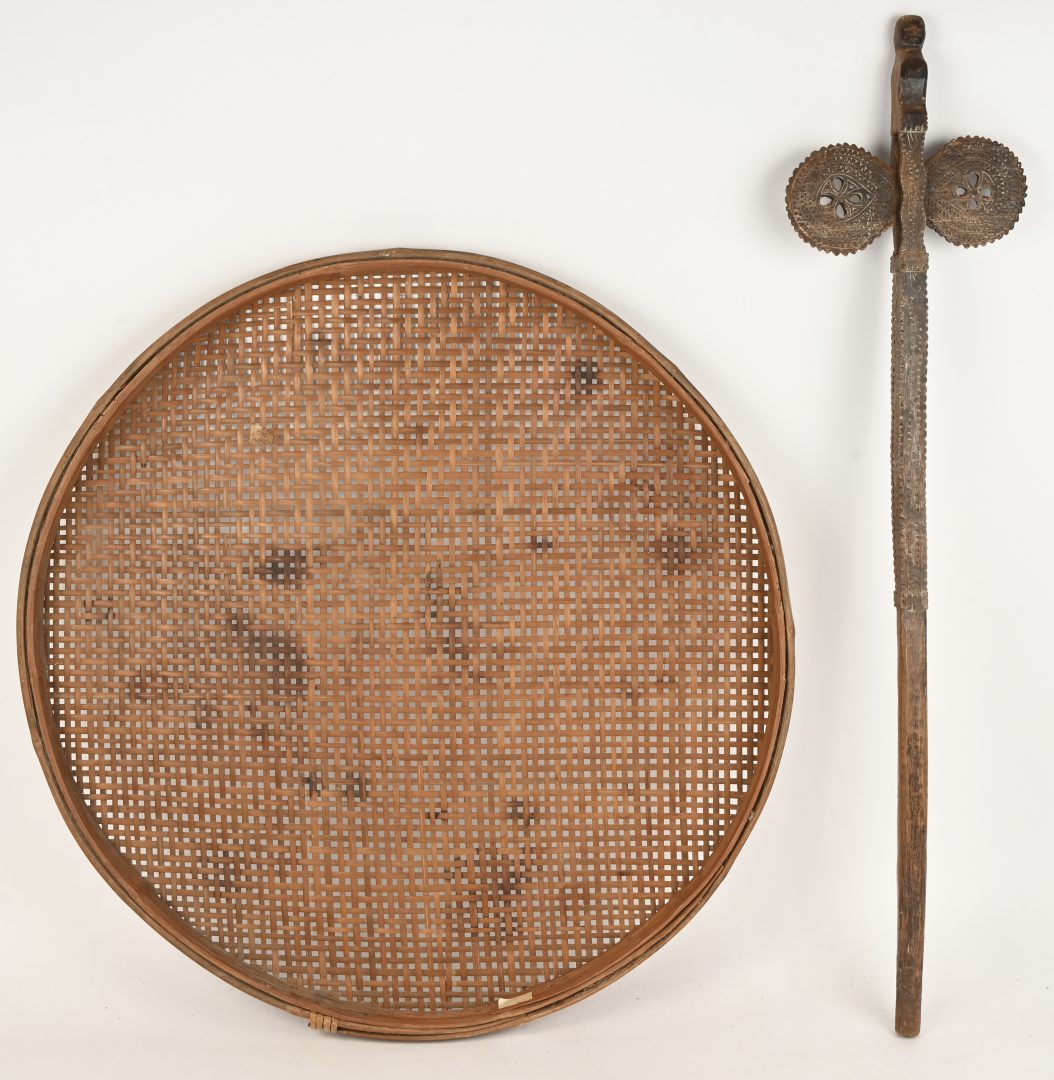 #266een lot van twee houten Afrikaanse objecten bestaande uit een buste een een schaaltje gedragen door drie figuren.