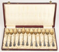 #14318 Kleine zilveren lepeltjes in etui. Twee verschillende formaten. De grootste zijn gemerkt 800 en de kleine 835. Met een gezamelijk brutogewicht van 410 gram.