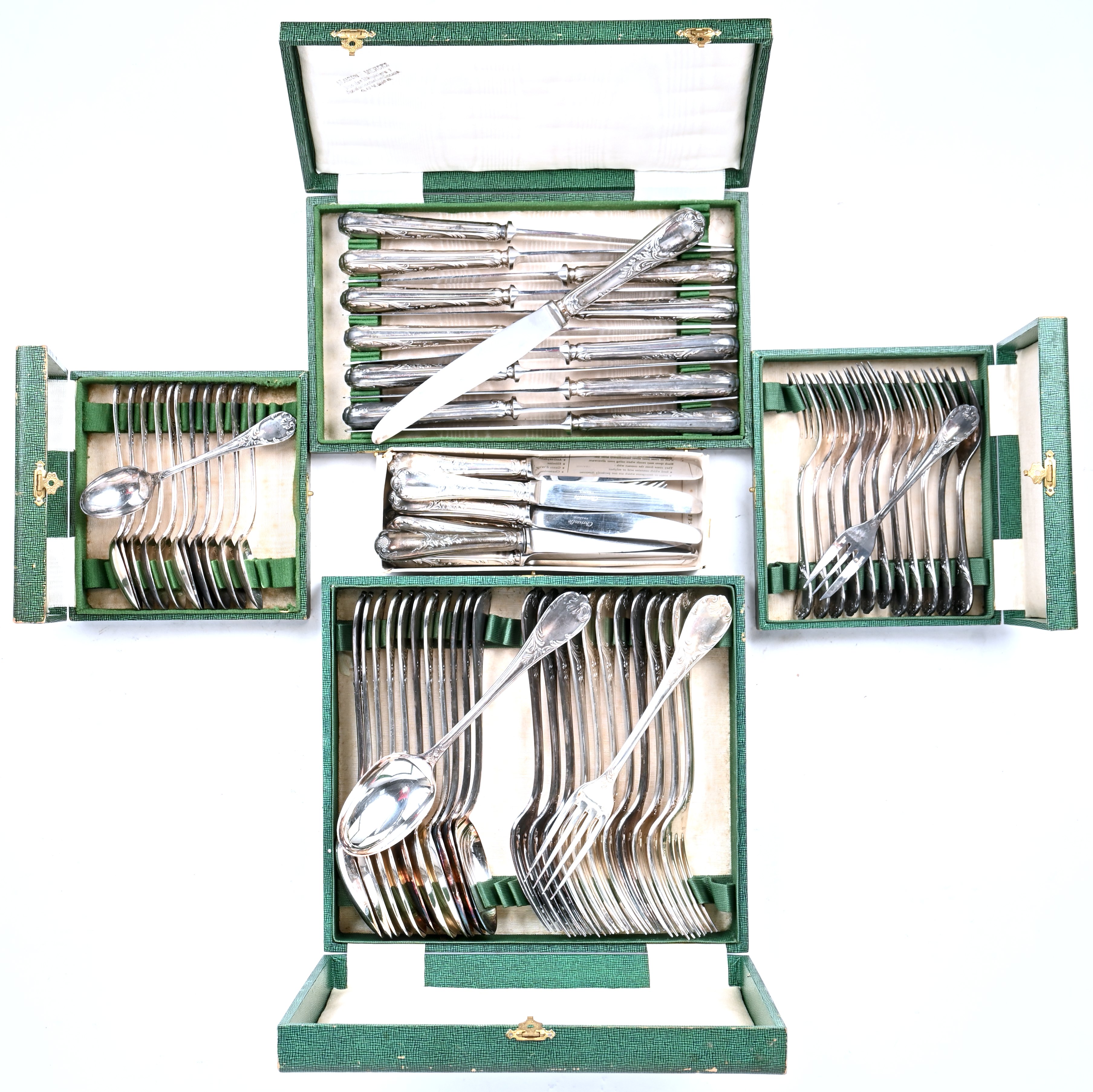 A Christofle cutlery set consisting of 12 dinner forks, 12 dinner spoons, and 12 dinner knives, 12 coffee spoons, 12 cake forks, 7 dessert forks, and 8 dessert knives.