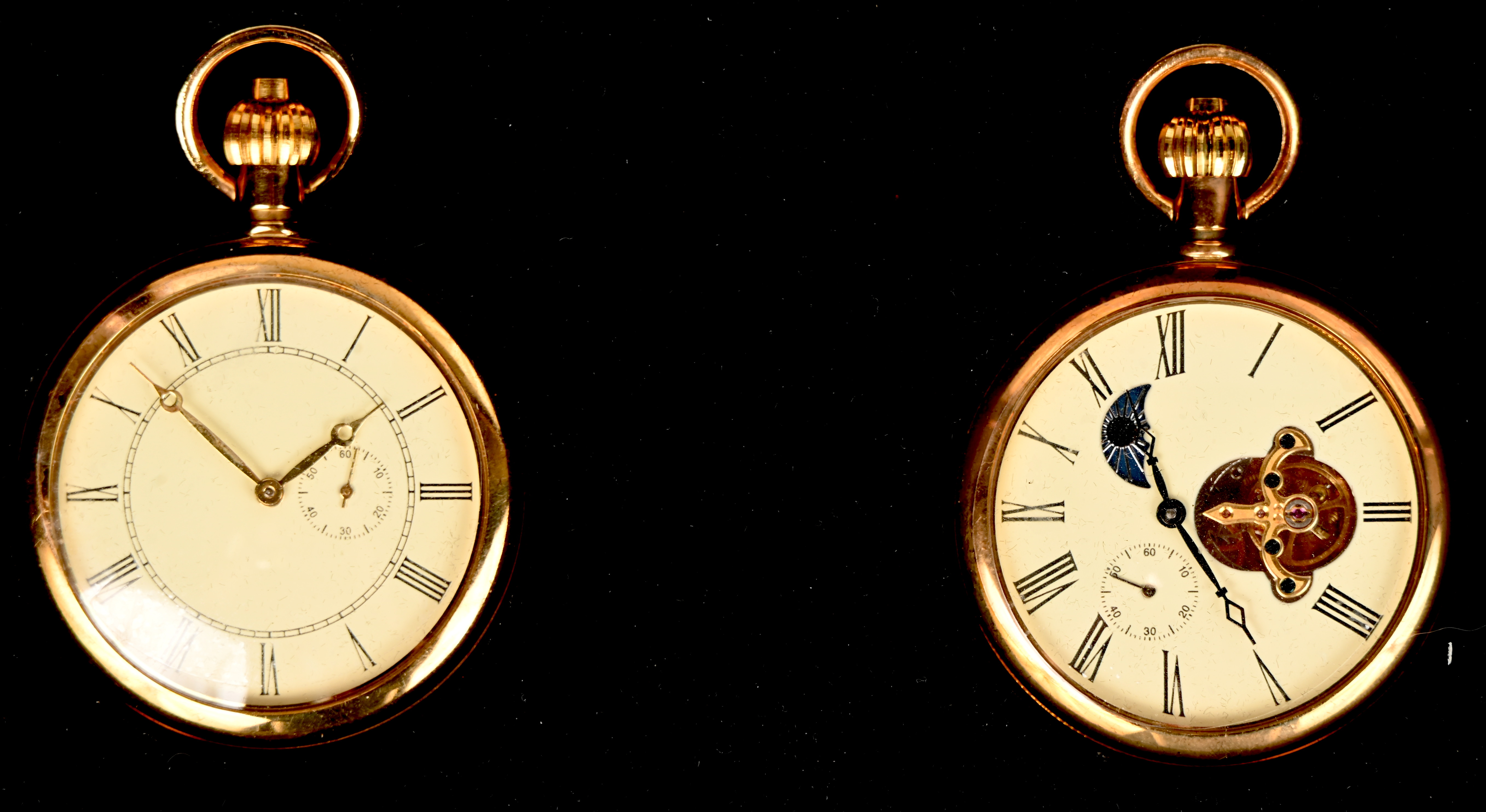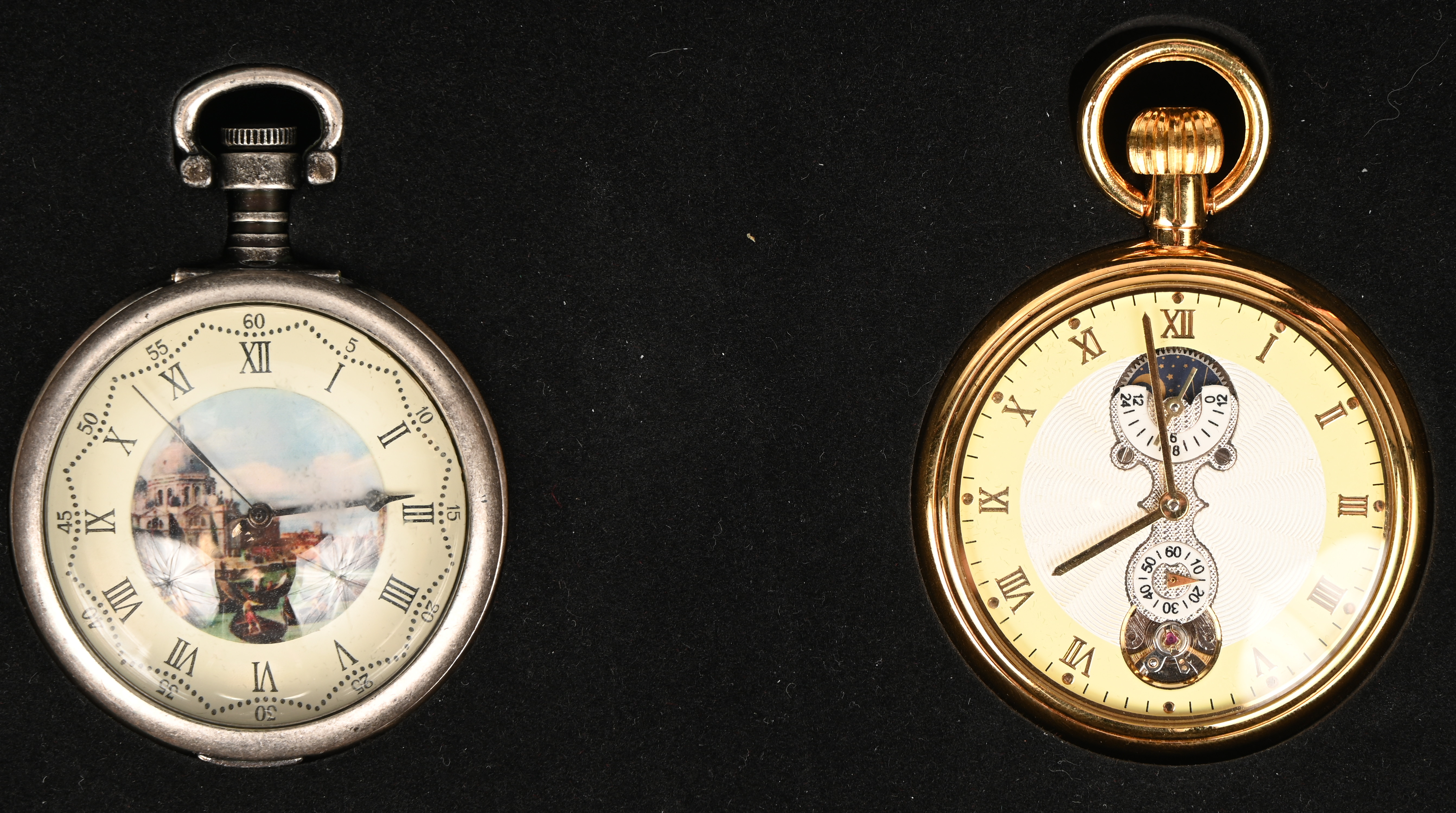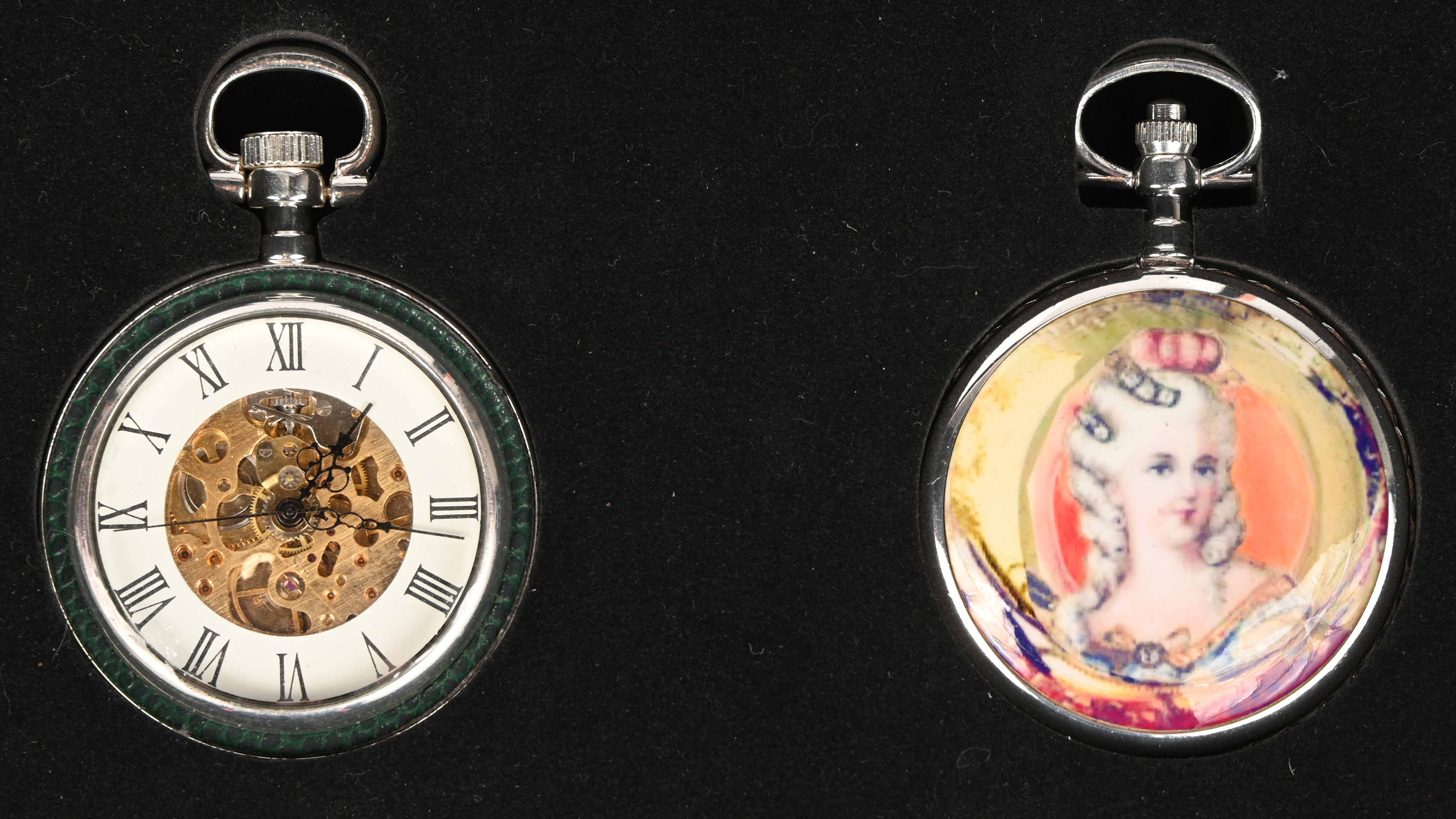 #253Twee kleine scheepsstuurwielen van gevernist hout en messing. Het ene gemerkt K100, het ander voorzien van een barometer en met het opschrift “Gott schützt den Steuermann in der Not, doch steuern muss er selbst.”