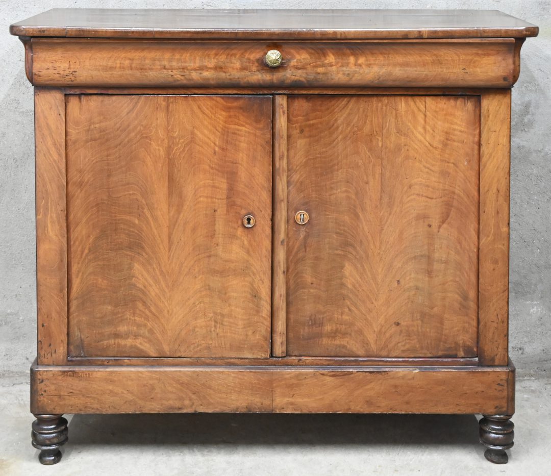 #559Een massief houten commode met gefineerde fronten. 2 deuren en 1 lade voorzien voor bestek.