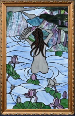 #69“Badend naakt met waterlelies”, een verlicht glas-in-loodraam, naar de art-nouveau.