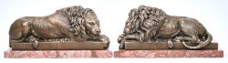 #153Een paar bronzen leeuwen op marmeren sokkel.