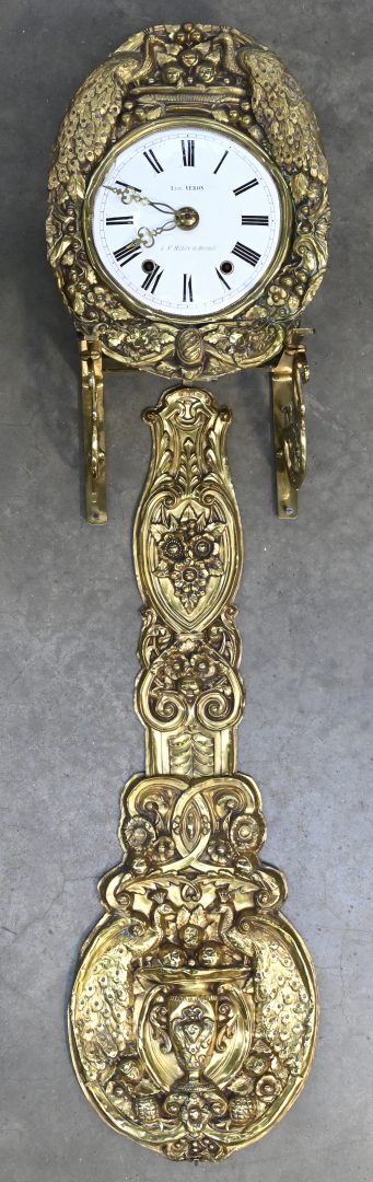 A Comtoise clock marked on the enamel dial: Léon Véron, à St. Hilaire-de-Harcouët, Dinanderie frame and pendulum with peacocks in the decoration. Damage to the enamel. With wall bracket.