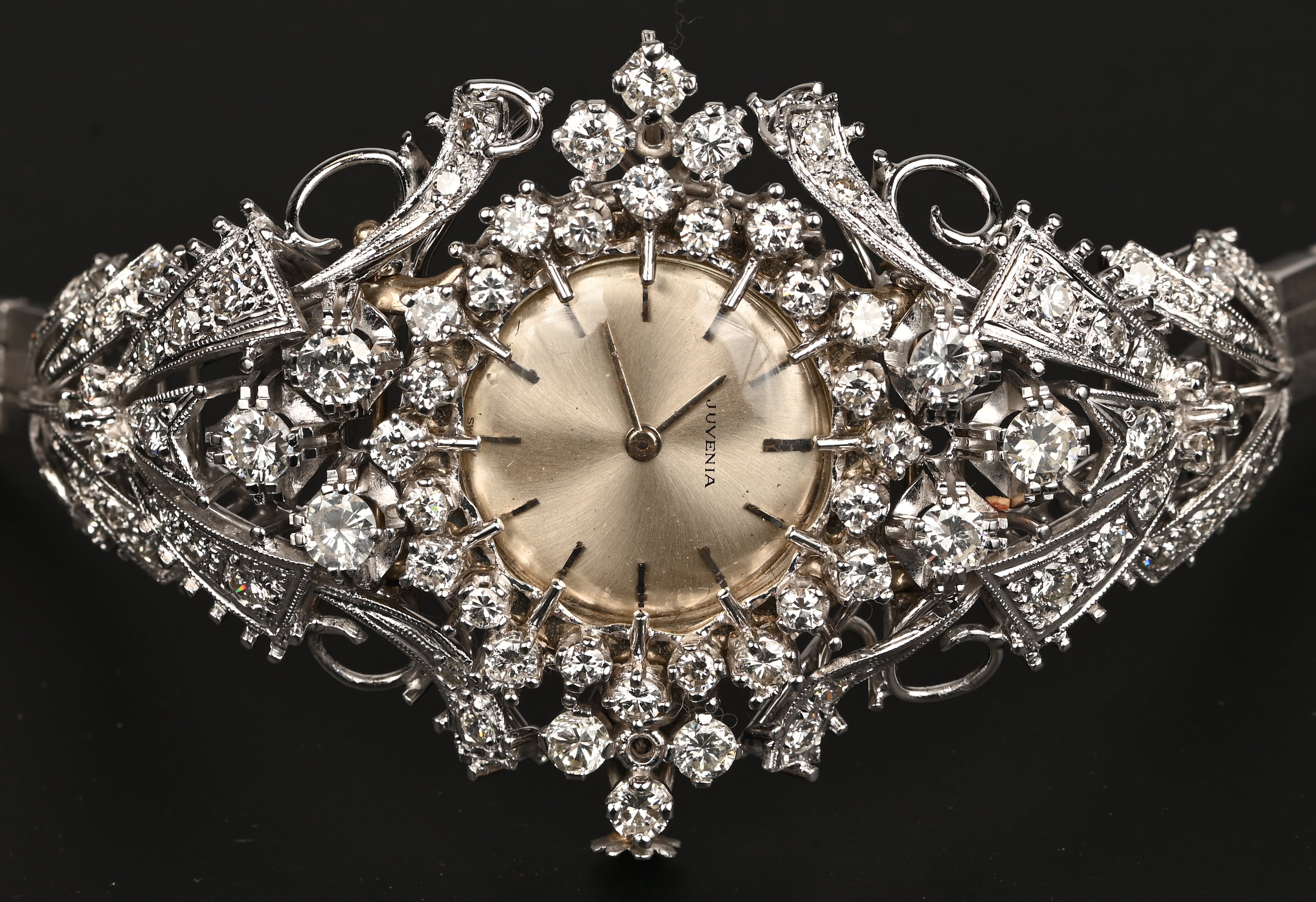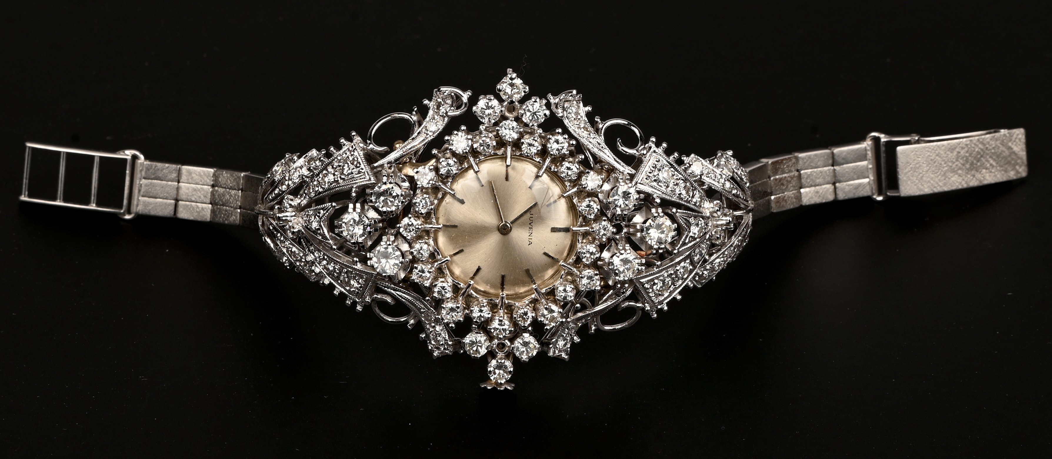 Een dameshorloge gezet in een 18 karaats witgouden armband bezet met briljanten met een gezamenlikk gewicht van +-3 ct.