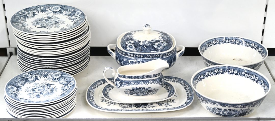 Een deel servies van zachte pasta met een blauw en wit bloemenmotief. Decor Balmoral. Onderaan gemerkt. 36 borden, twee groentenkommen, een sauskom, een schotel en een terrine.