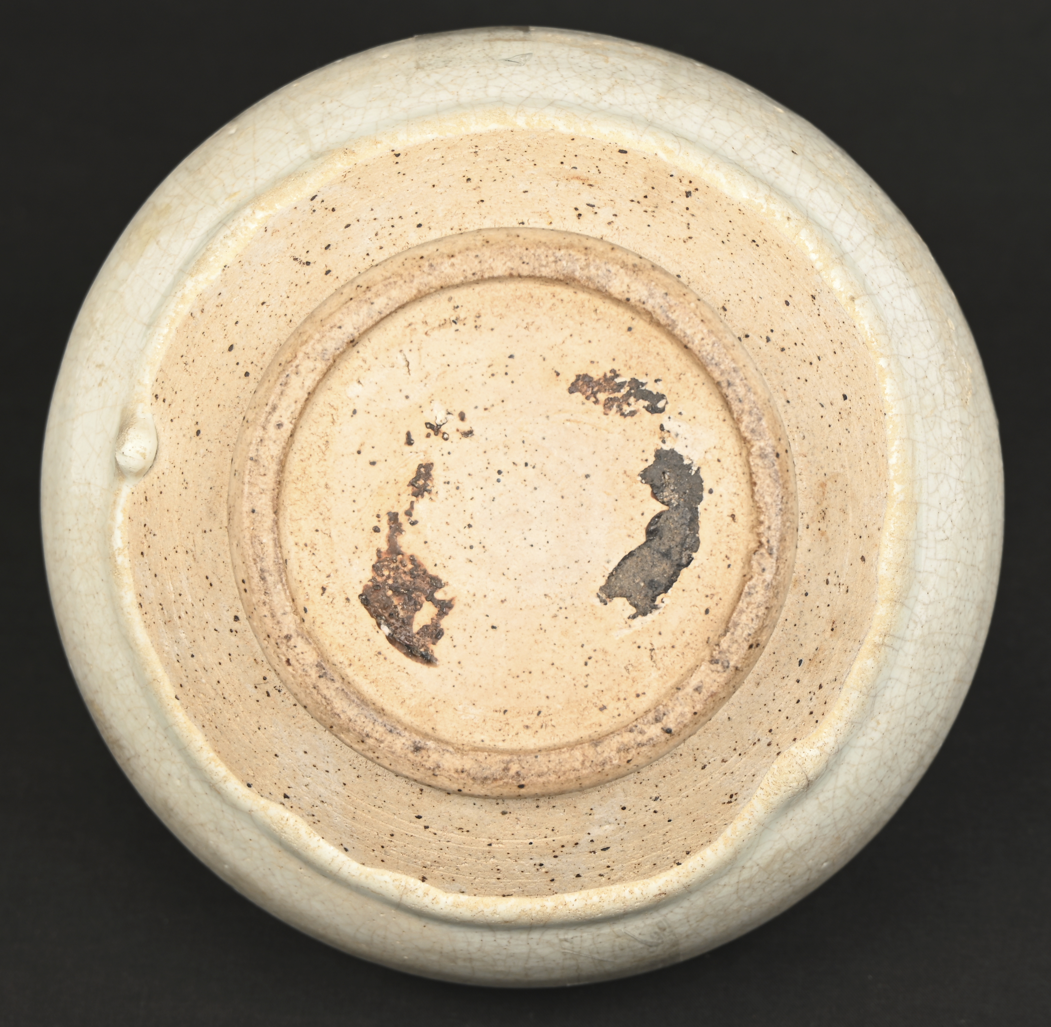 A brush washer, celadon glaze, firing flaw and a few hairlines. With wooden base. -