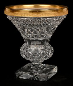 A chalice-shaped vase of colorless cut crystal, with a gold-colored metal rim. Not marked. -