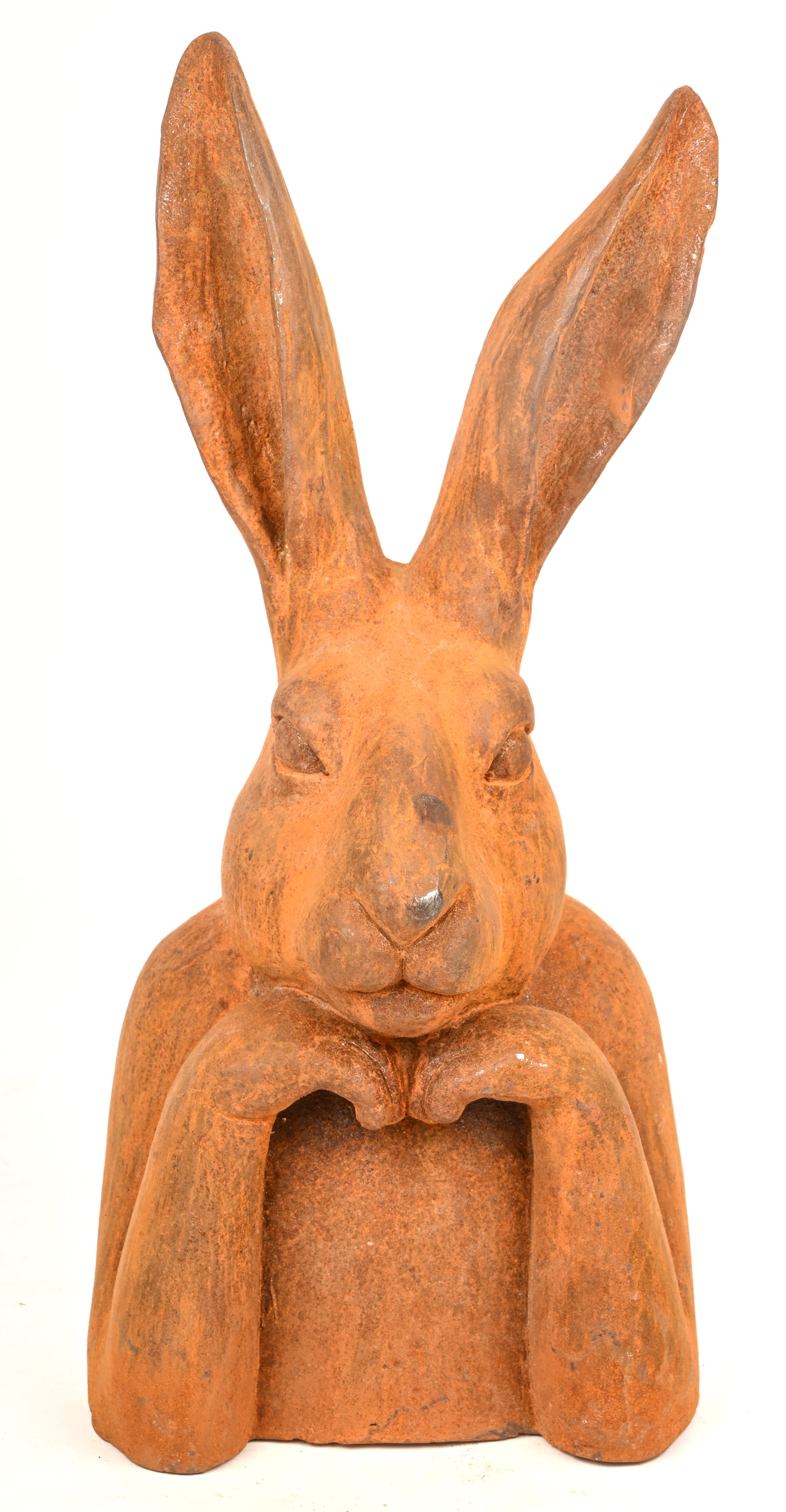'Rabbit with a bouquet of flowers', a cast iron statue with rust patina. Unmarked.No longer availableDim. Hoogte 25 cmEstimate: € 60 / 80 -