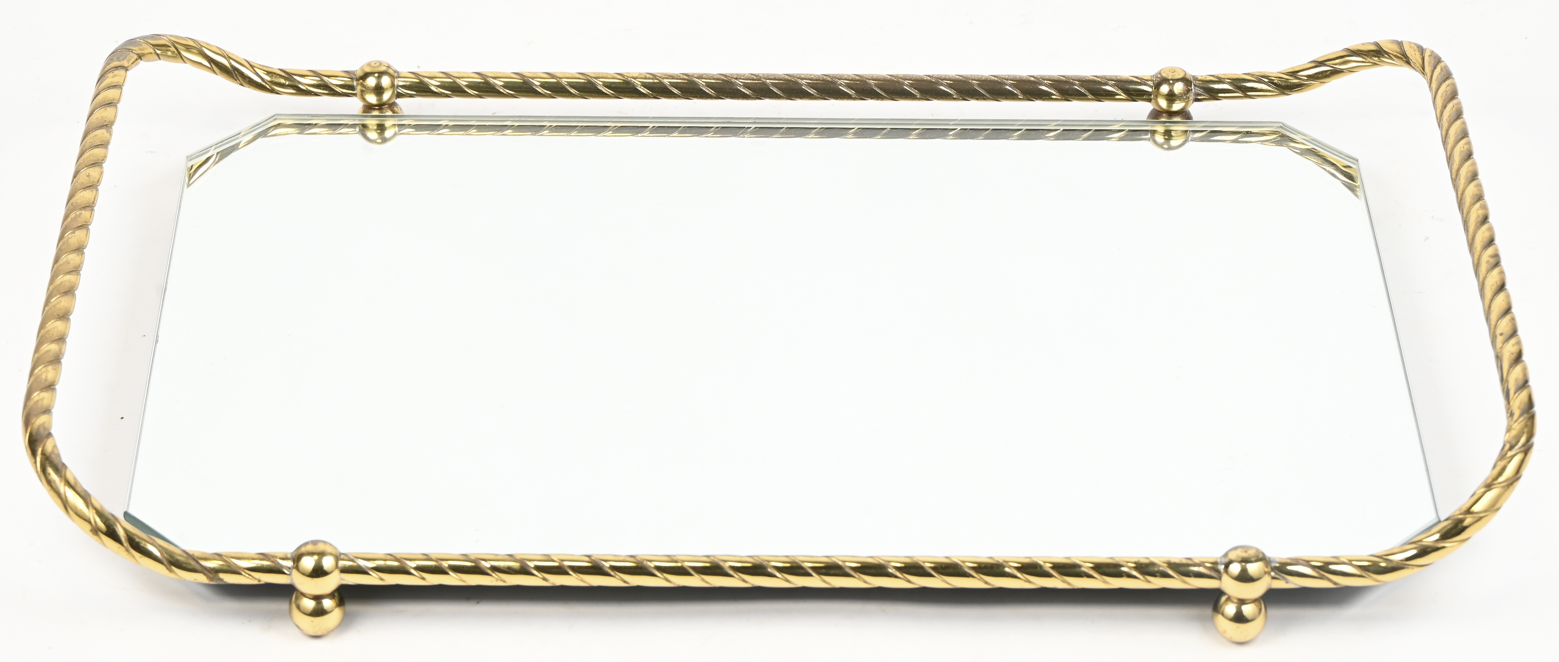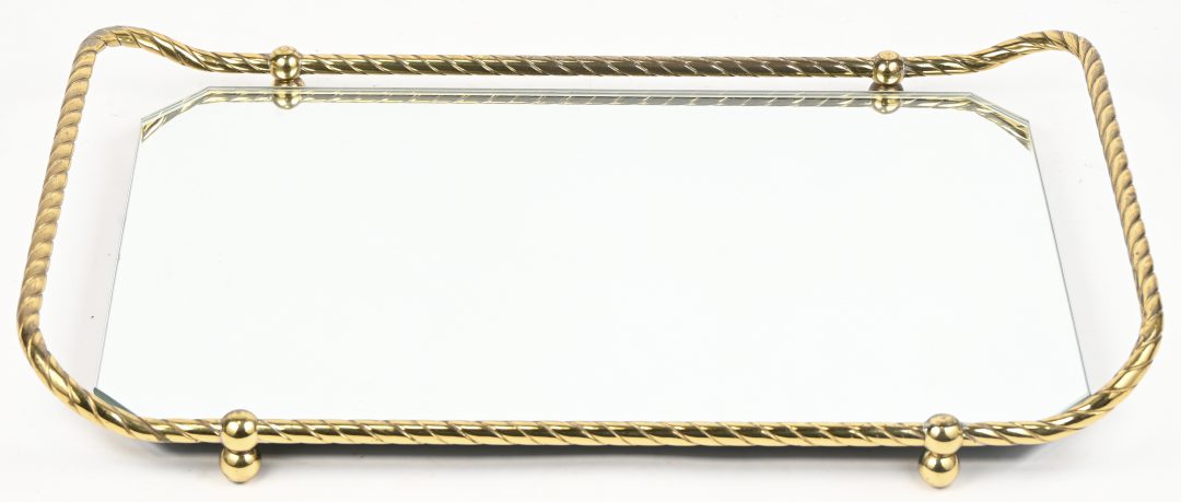 Een mahoniehouten psychéspiegel met onderaan een lade. XIXde eeuw. Achteraan is een pootje manco
