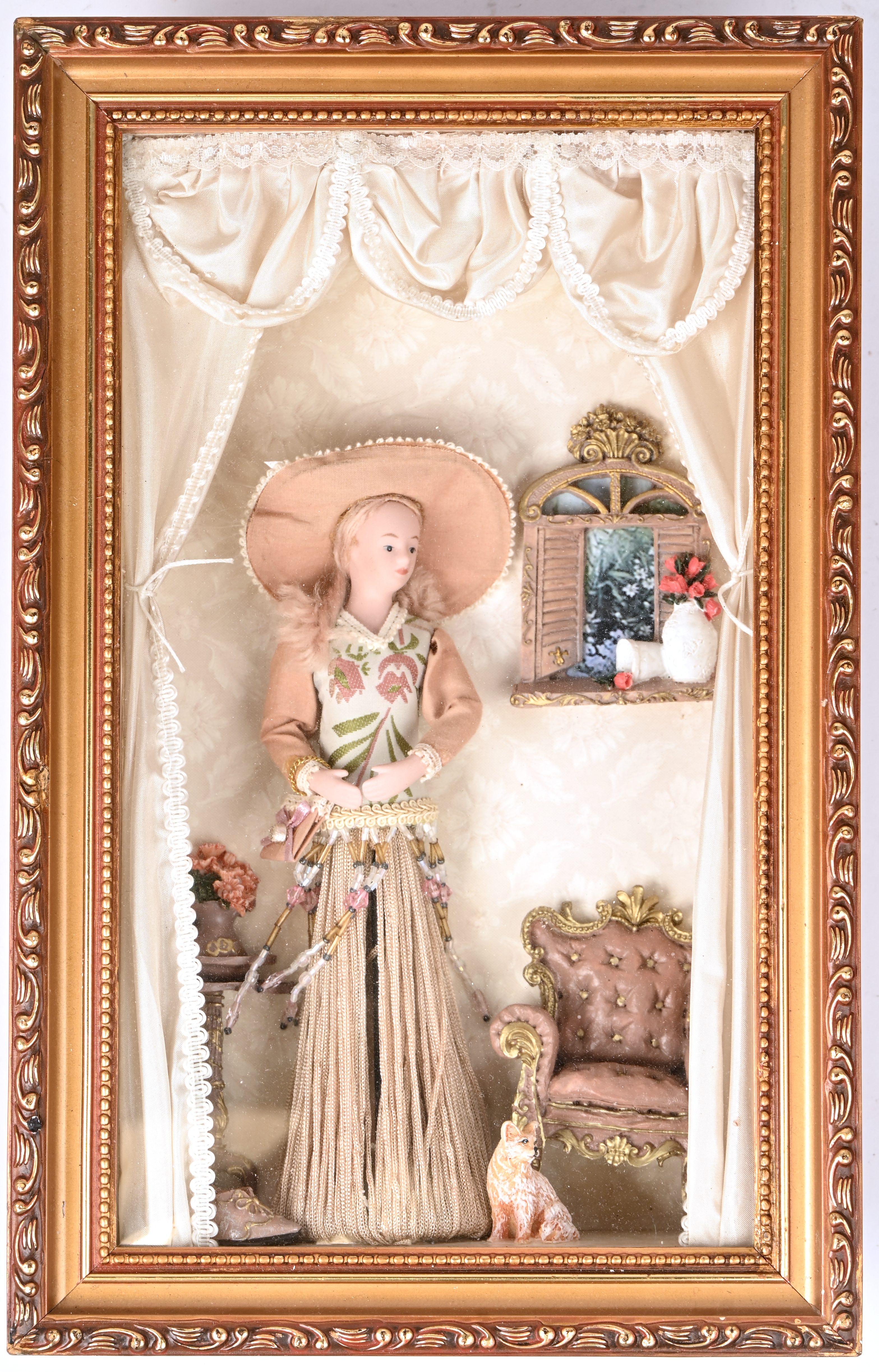 A deep frame with a diorama depicting a 19th-century interior.