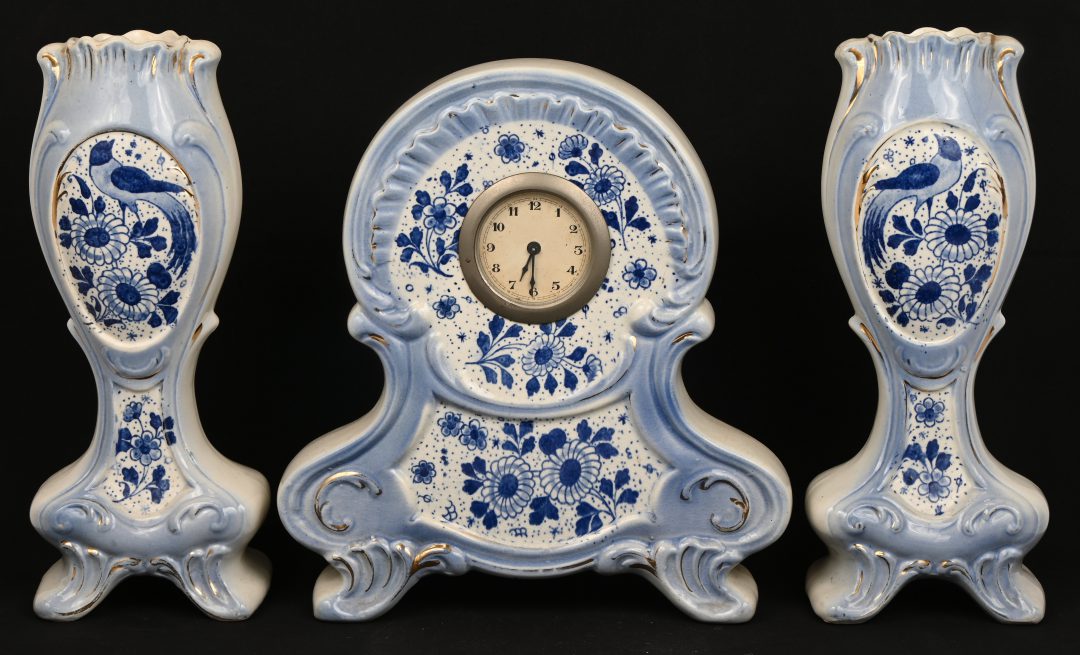 Een driedelig klokstelletje van blauw en wit aardewerk. Onderaan gemerkt: AMC.