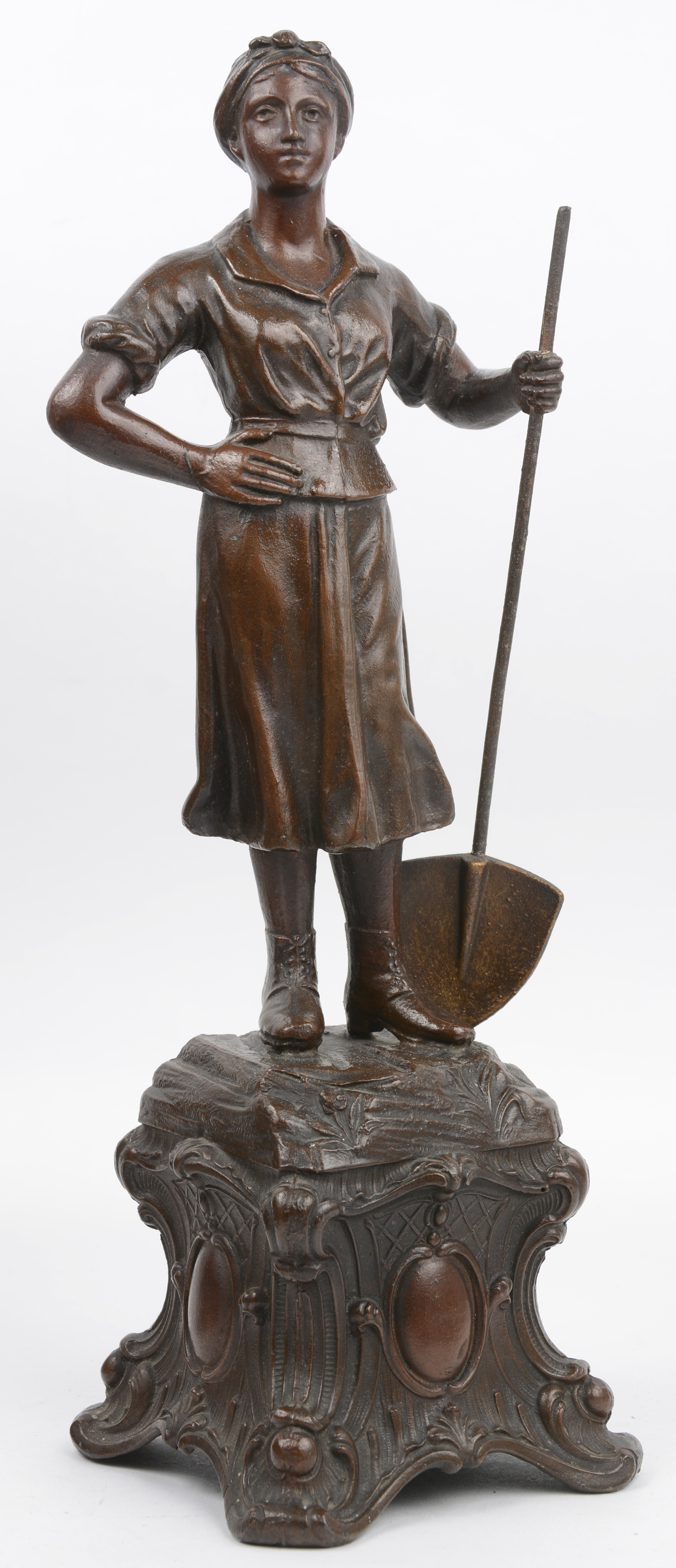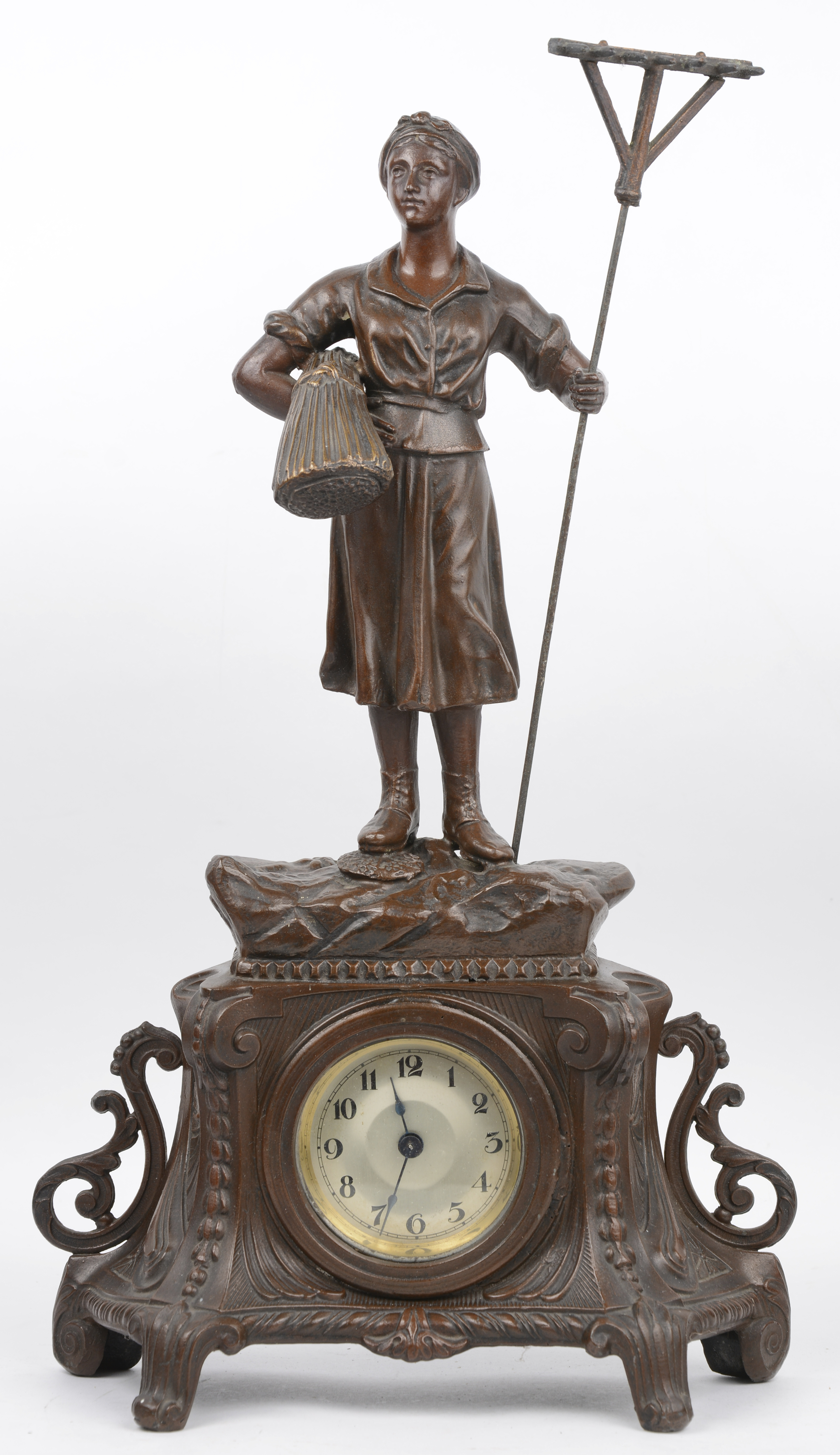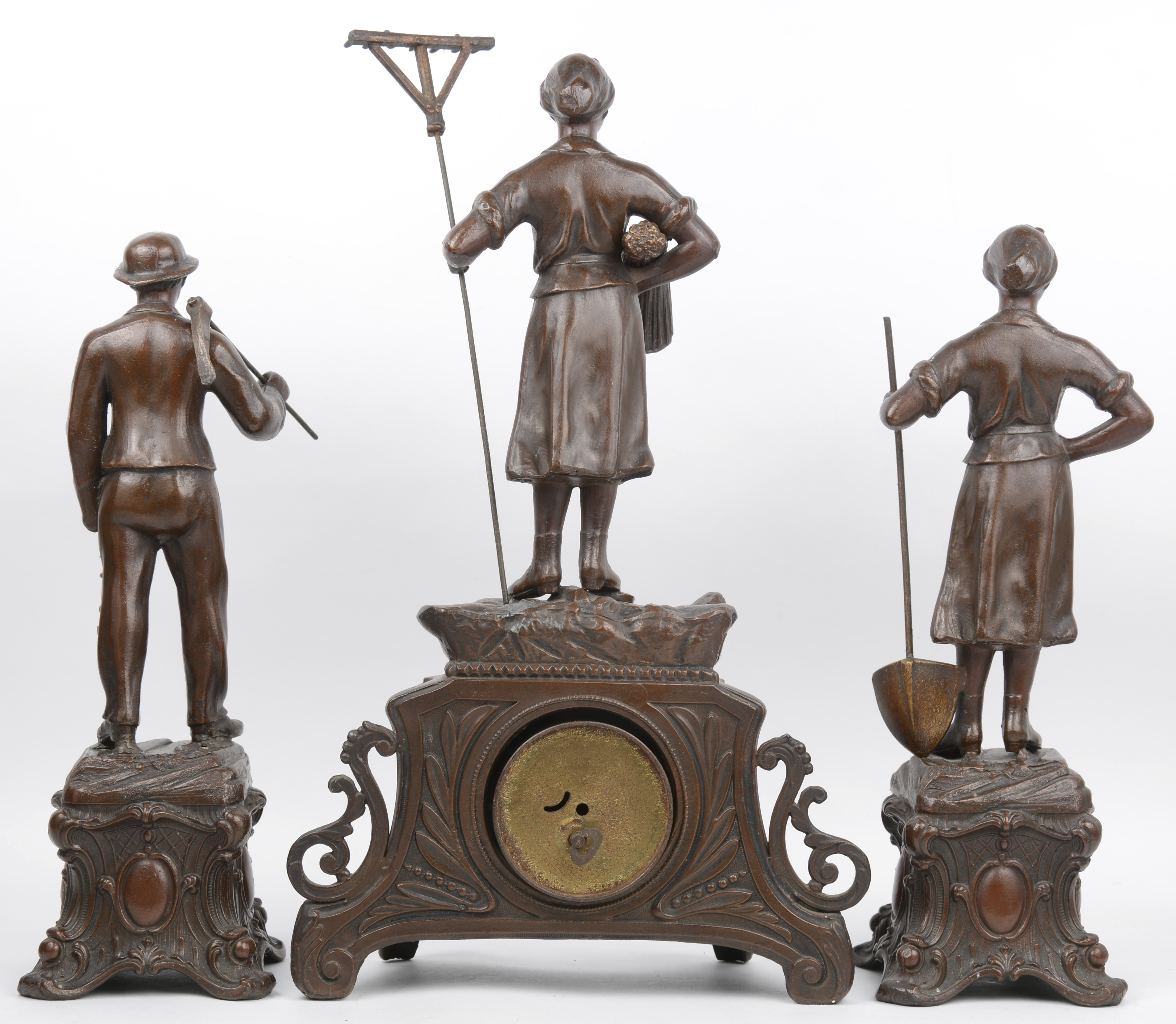 A three-piece clock set in zamak. The clock is decorated with a female farmer flanked by a miner and a female worker. Early 20th century.