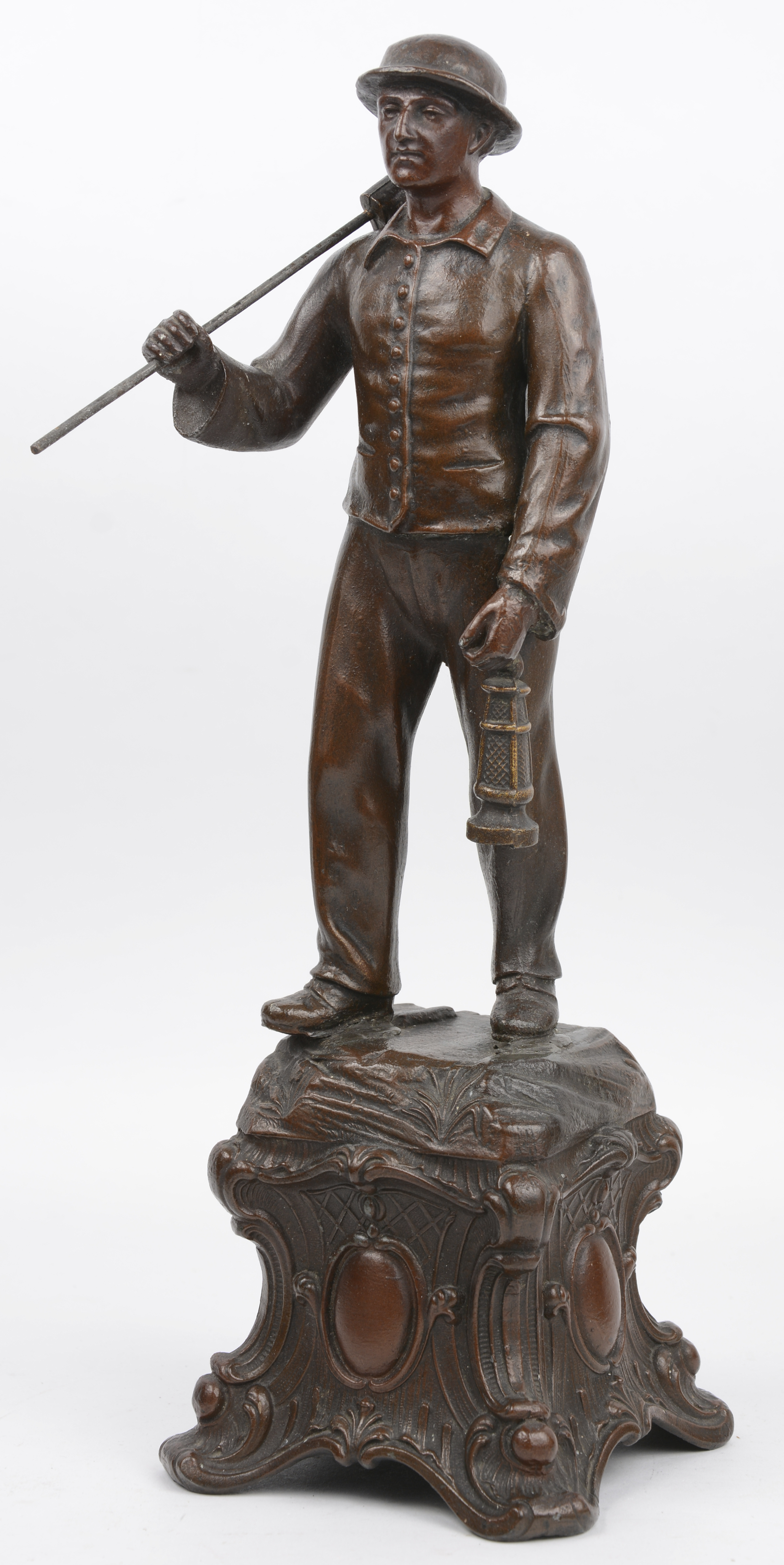 Een driedelig zamakken klokstel. De pendule getooid met een landbouwster geflankeerd door een mijnwerker en een arbeidster. Begin XXe eeuw.