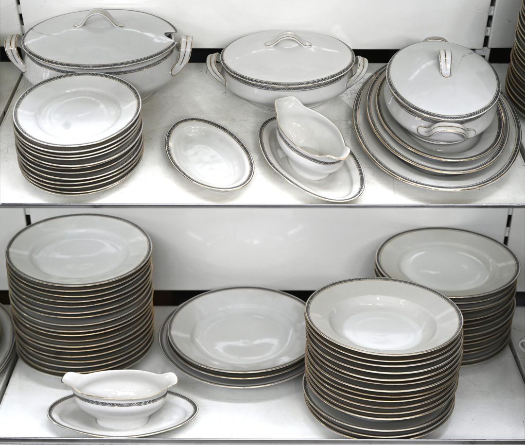 #187Limoges, FranceEen 63-delig porseleinen servies, Raynaud & Co, bestaande uit: 1 koffiepot, 1 theepot, 1 melkkan, 1 suikerpot, 11 tassen, 10 ondertassen, 2 terrines, 1 grote kom, 1 sauskom, 4 schalen, 18 platte borden, 6 diepe borden en 6 dessertborden.