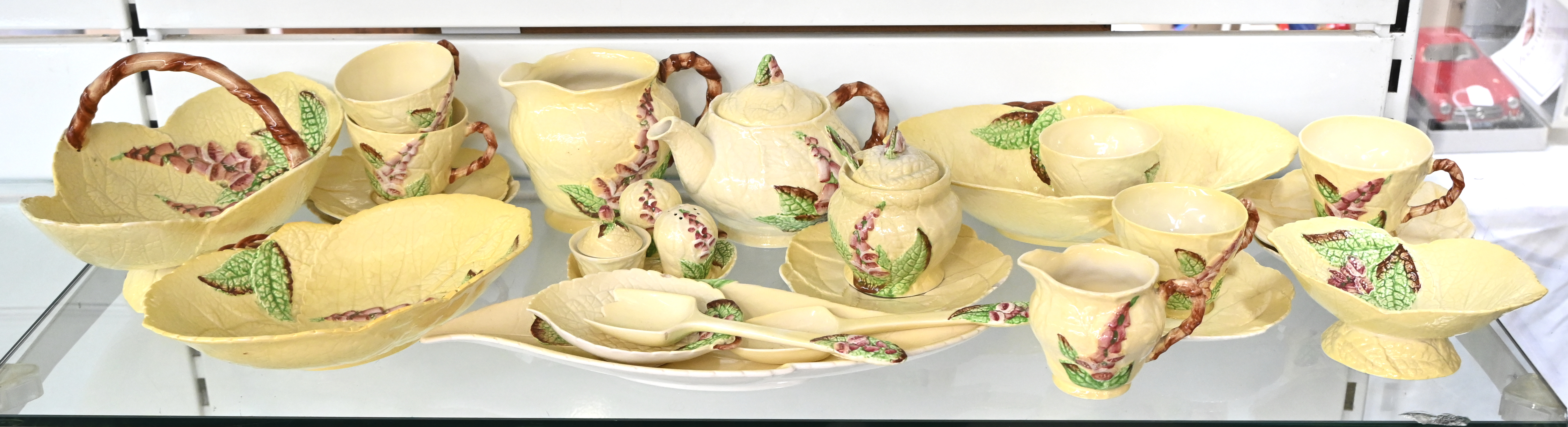 Een Engels aardewerken serviesje bestaande uit o.a. vijf kopjes met schoteltjes, een cakebordje, een gebakbordje, een theepot, een suikerpot, een melkpotje, een broodmandje en een schenkkan. Onderaan gemerkt.