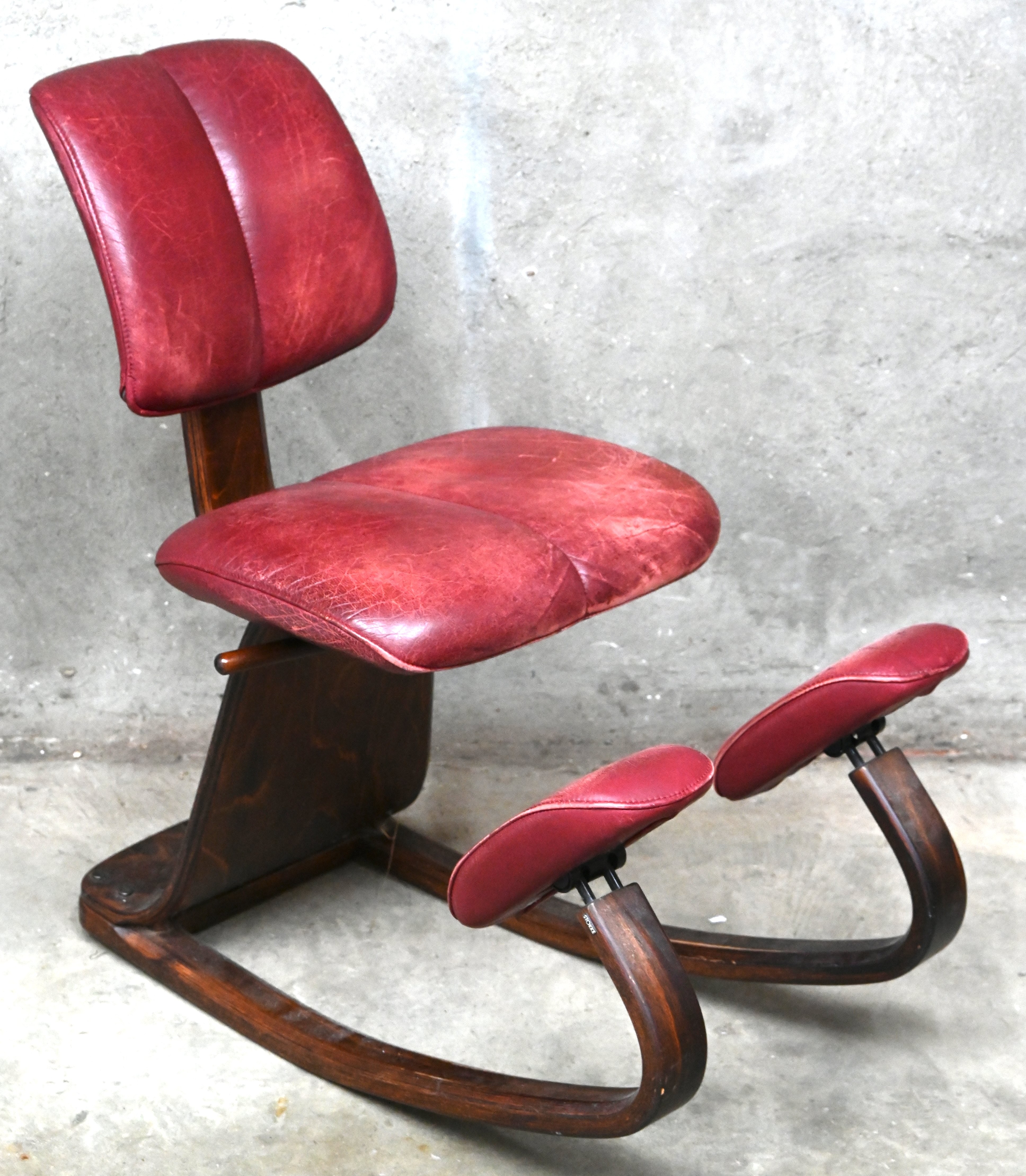 An ergonomic chair, beech wood with leather upholstery, marked Stokke. 1 bolt has been replaced.