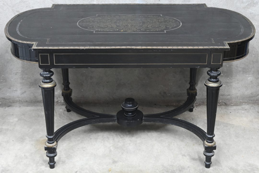 Een gemarquetteerde ronde tafel in Victoriaanse stijl op centrale voet.