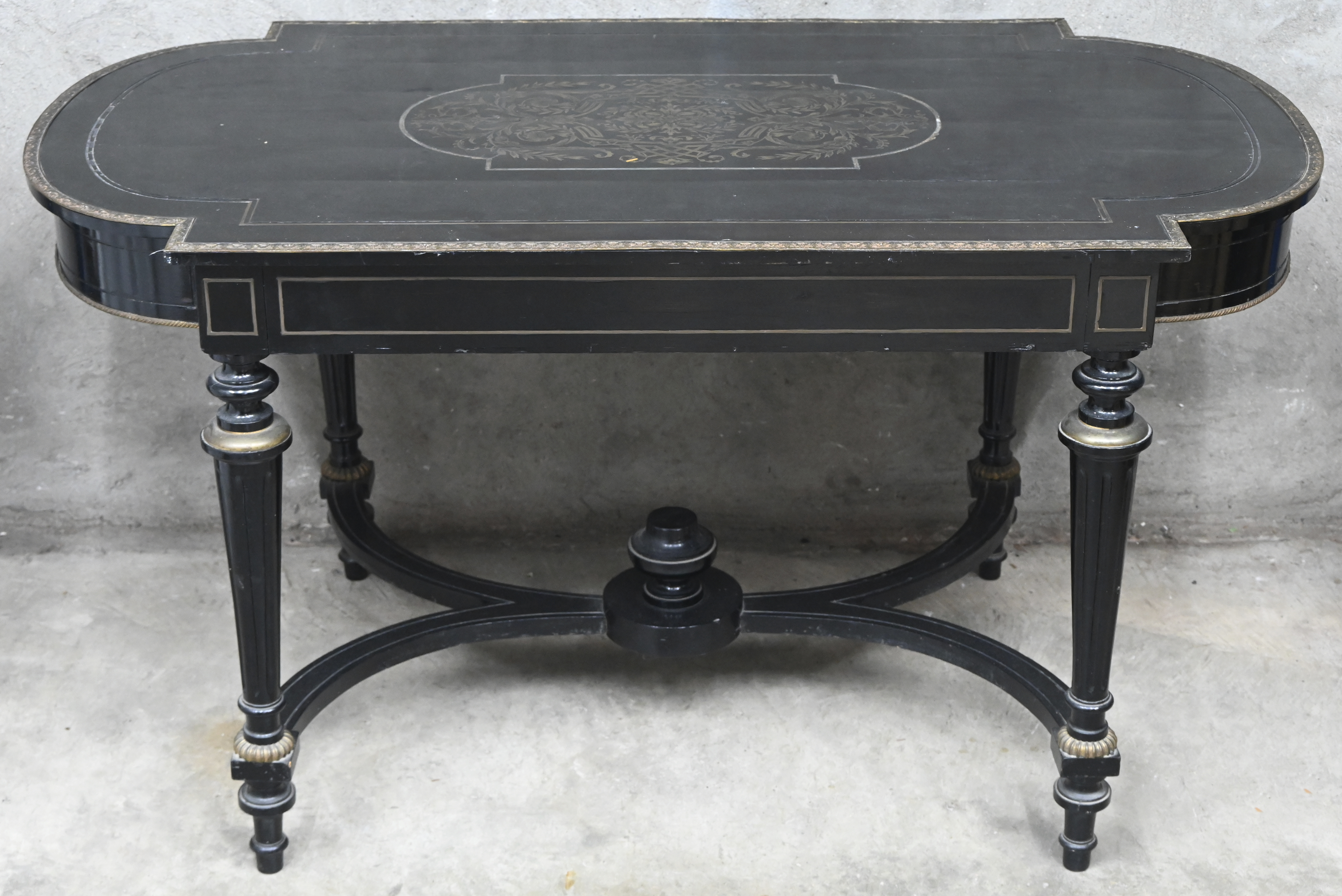 An antique side table with two drawers, a brass insert, and a wooden lid. Marquetry decoration. Some wear on the veneer. -