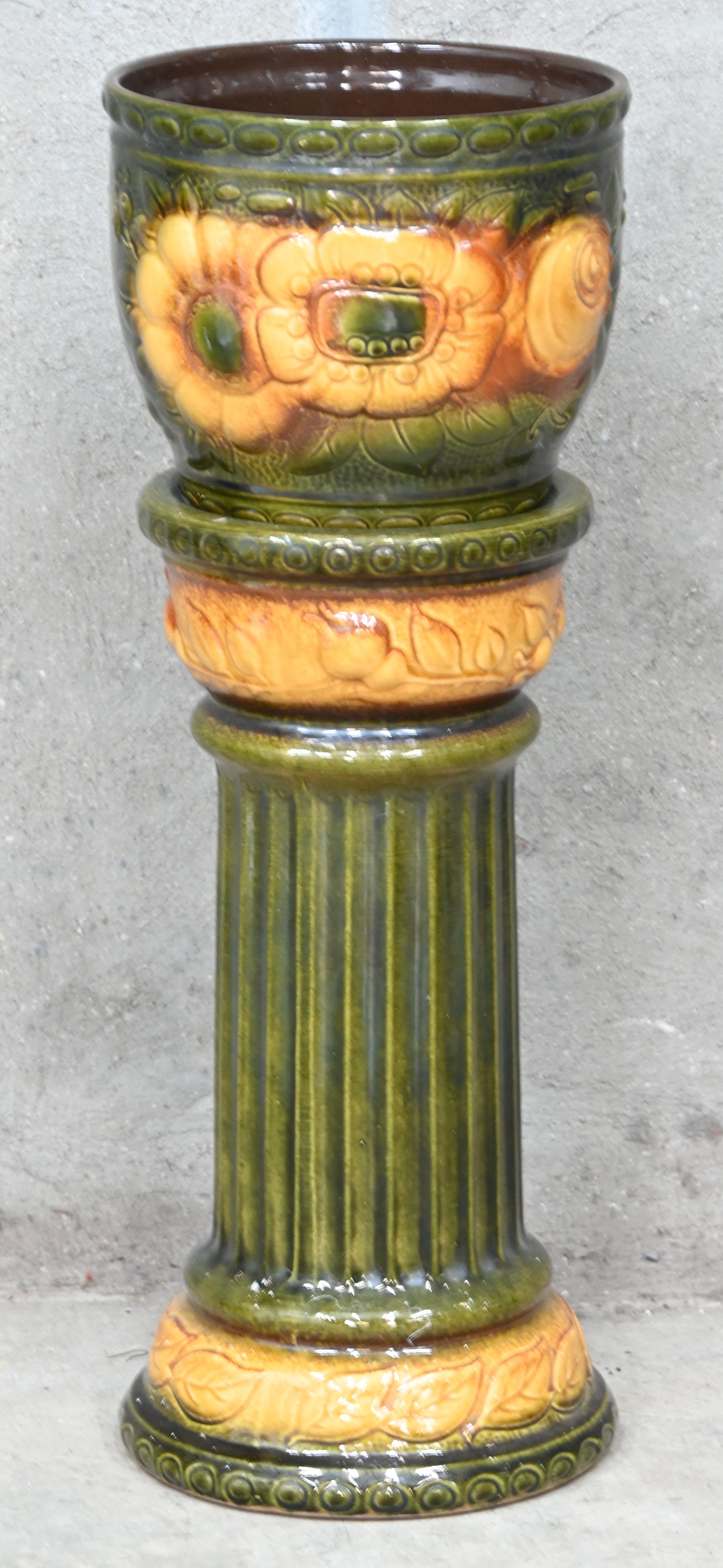 Een geglazuurd aardewerken jardinière op sokkel.
