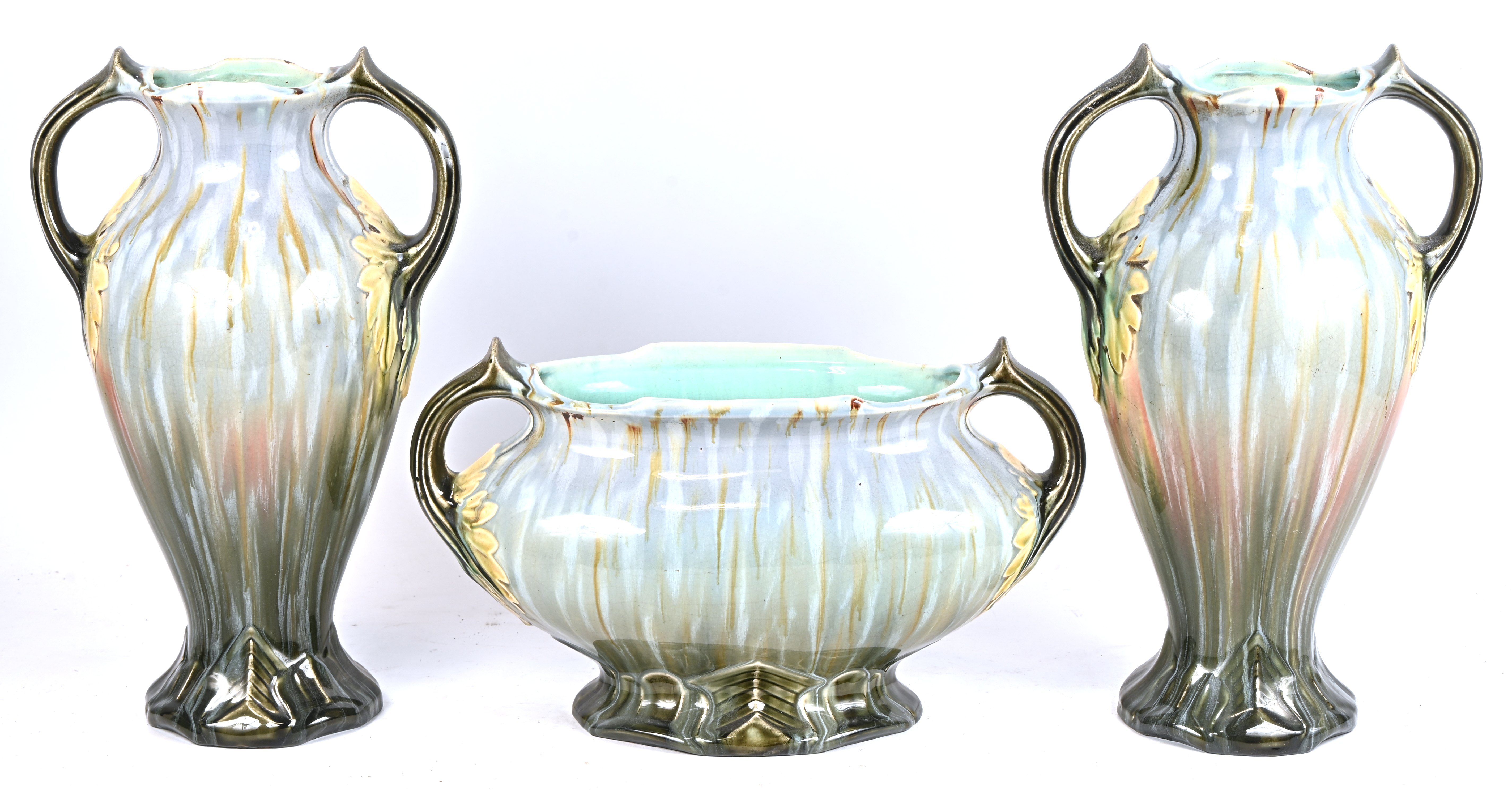 #98Een Limoges schouwgarnituur bestaande uit een coupe met deksel en twee cassoulet vazen. Van meerkleurig porselein met messing ornamenten. Decor Versailles, or mat à la main.