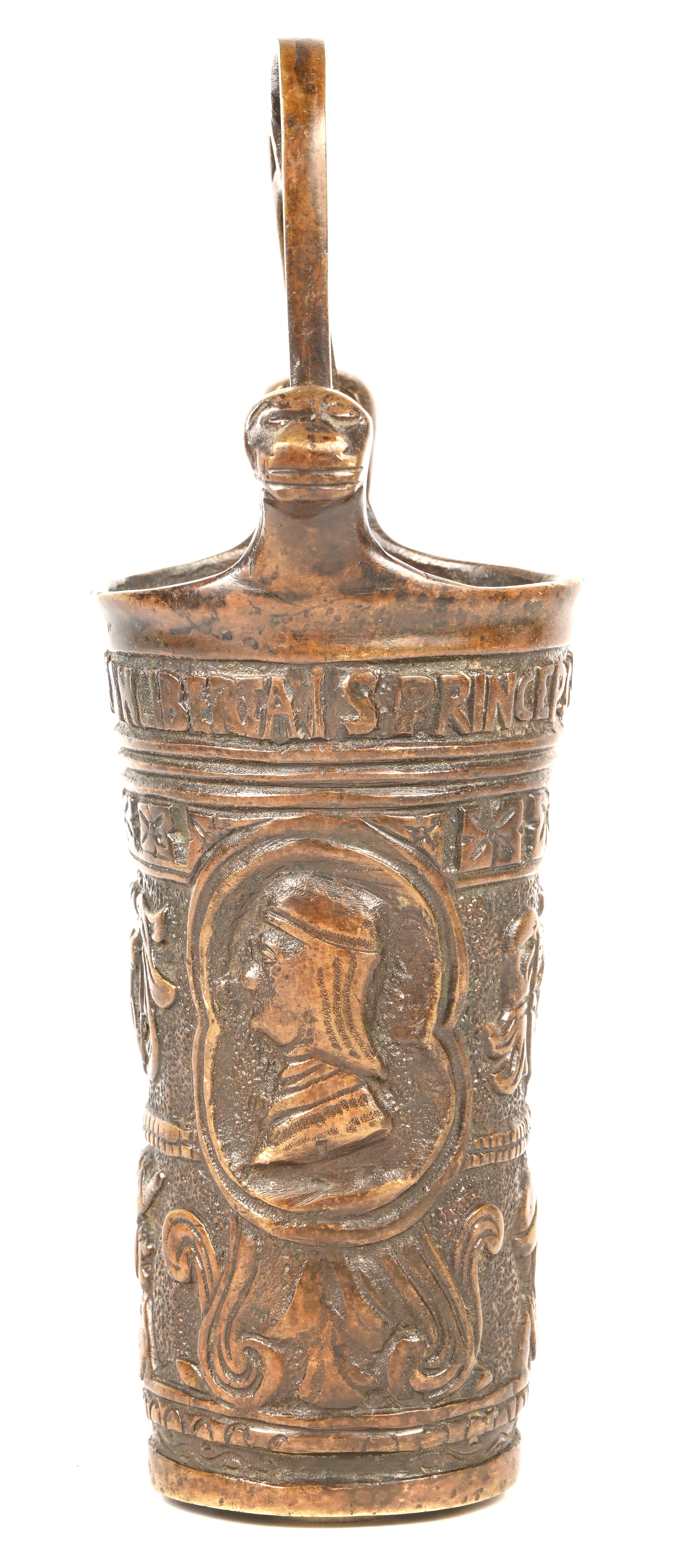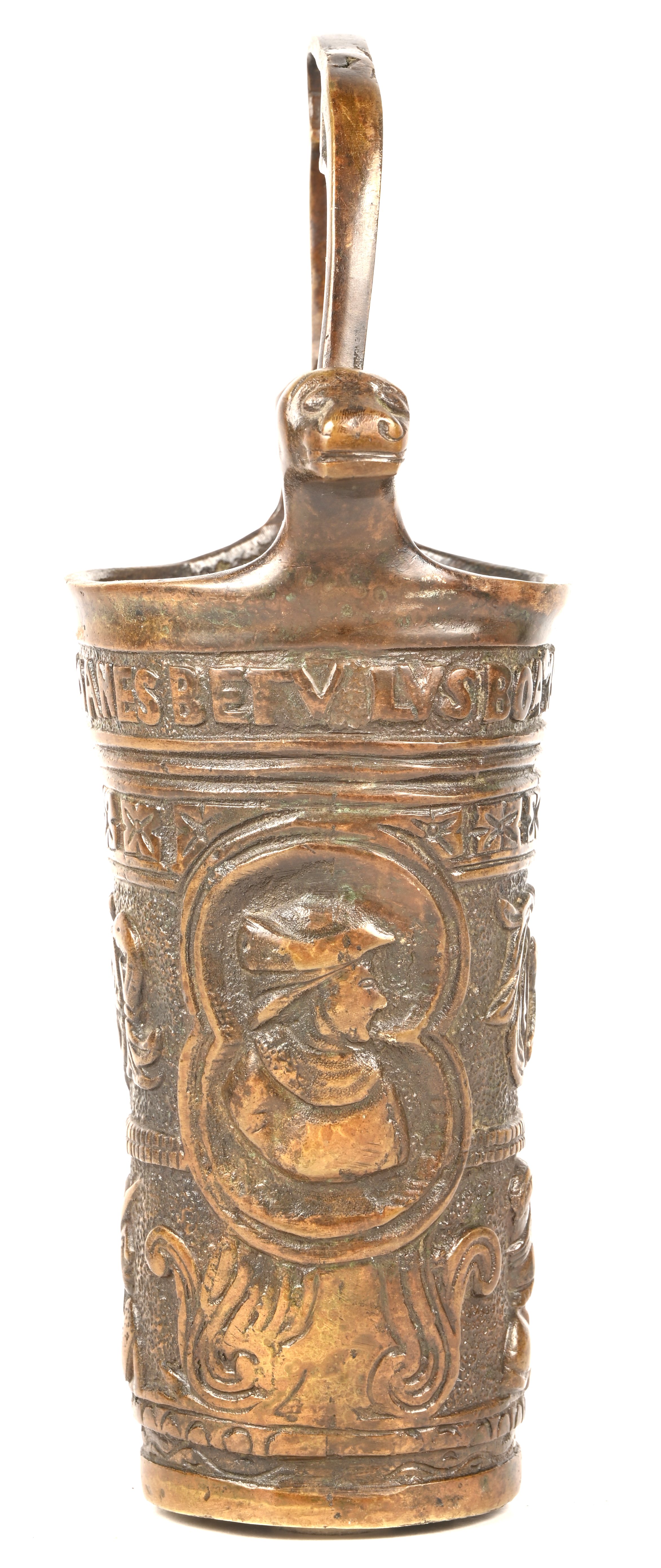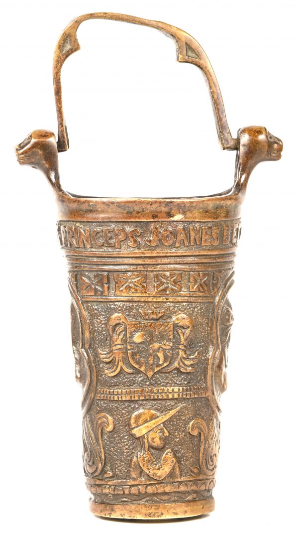 #65Een antieke koperen beddenpan met een tweekoppige adelaar gedecoreerd.