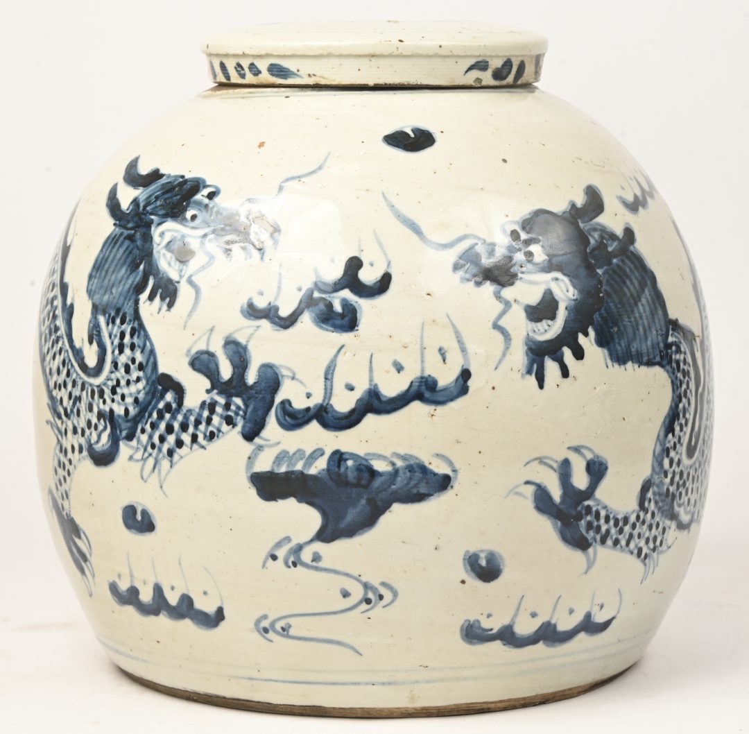 Een gemberpot van Chinees porselein met een blauw op wit drakendecor.