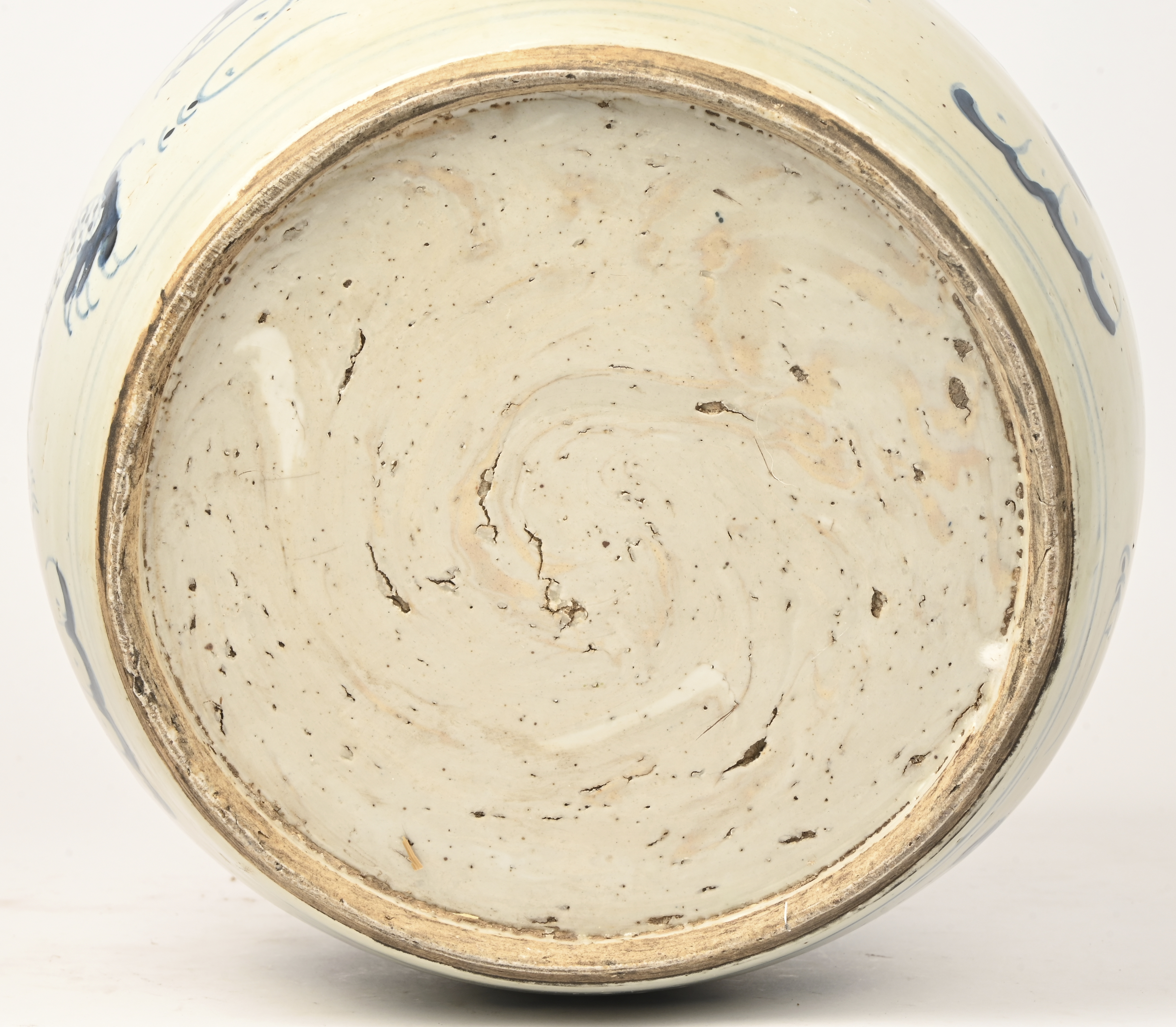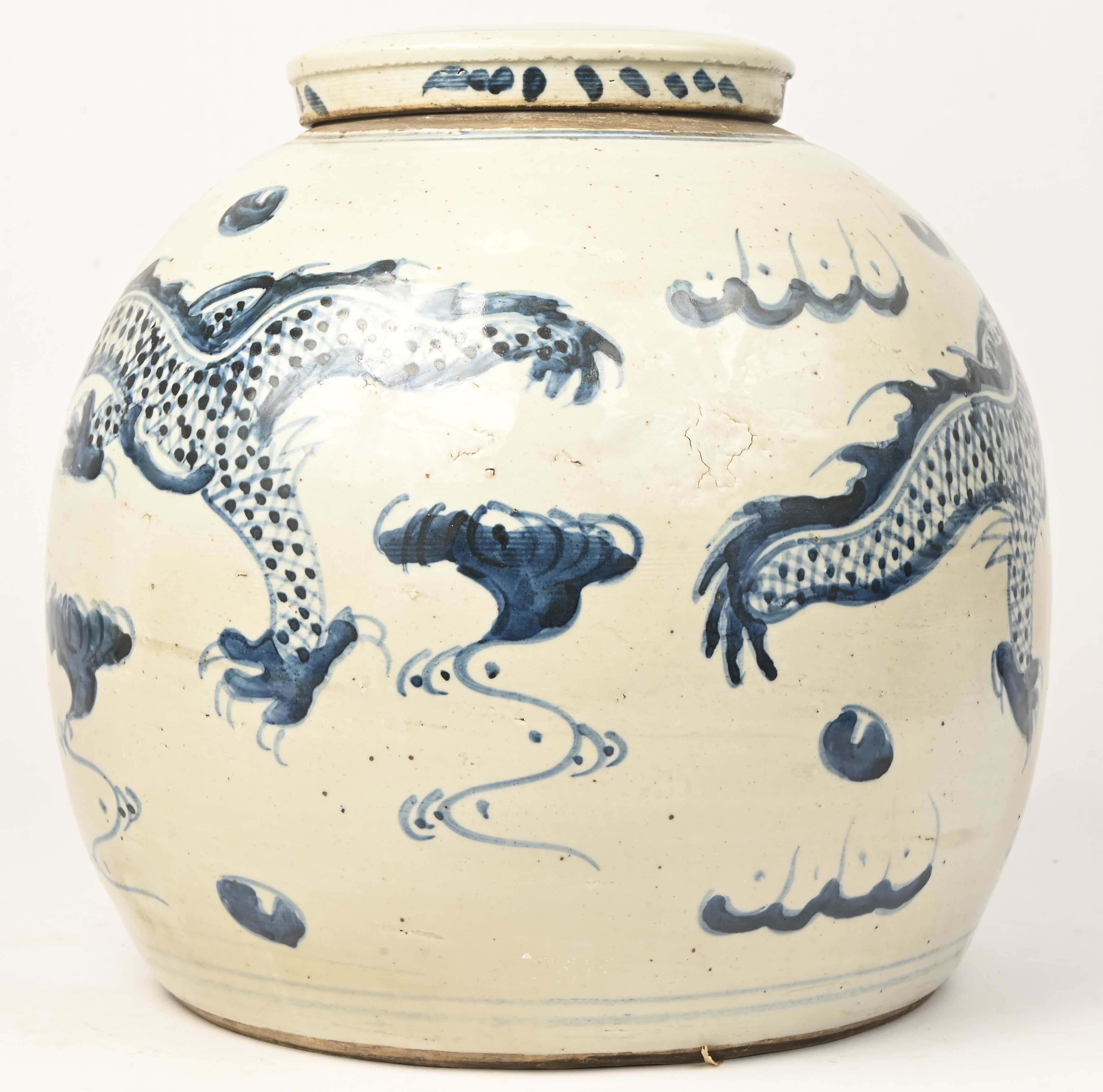 A ginger jar of Chinese porcelain with a blue on white dragon decoration.