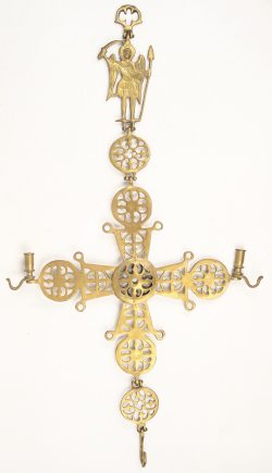 #94Een koperen hangkandelaar met de aartsengel Michael.
