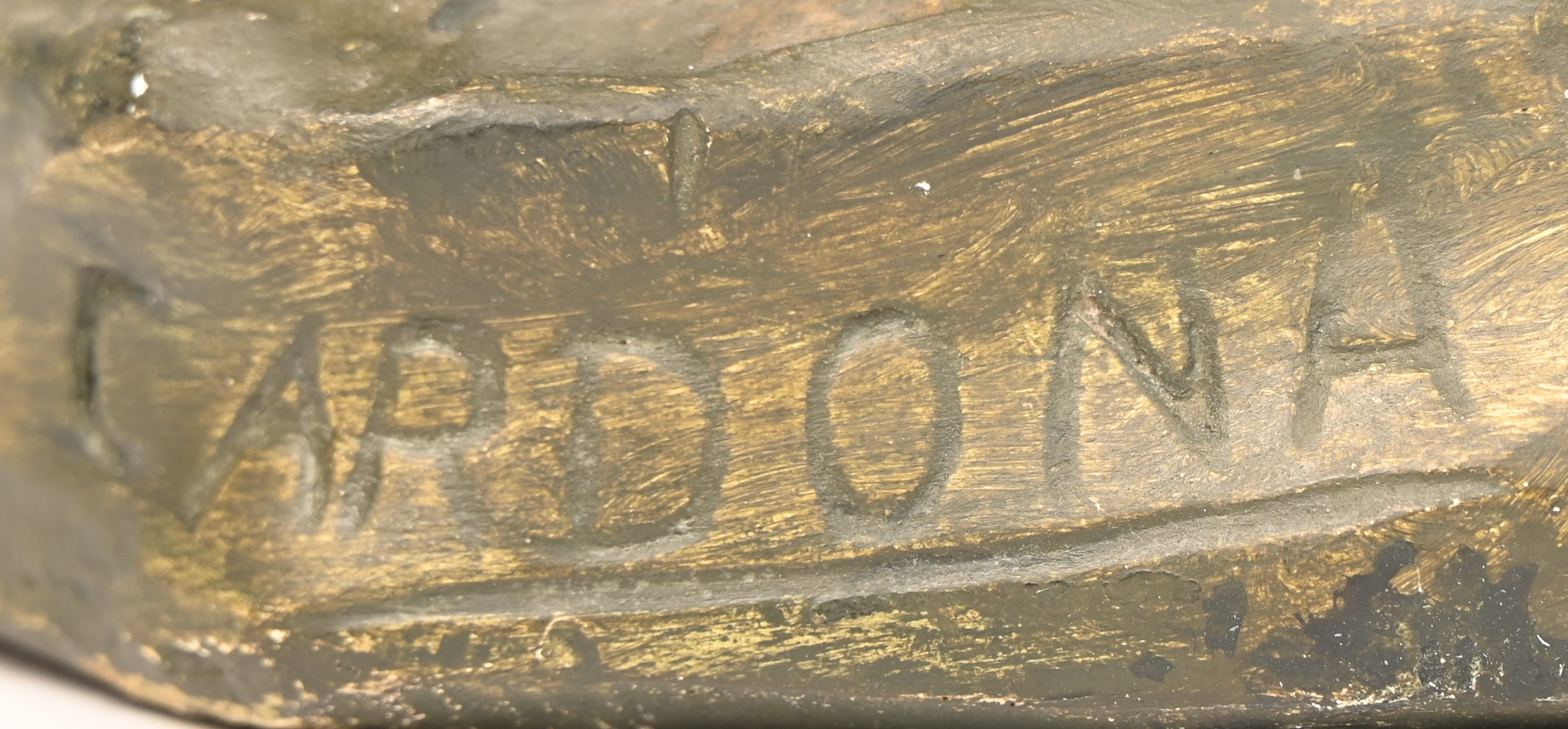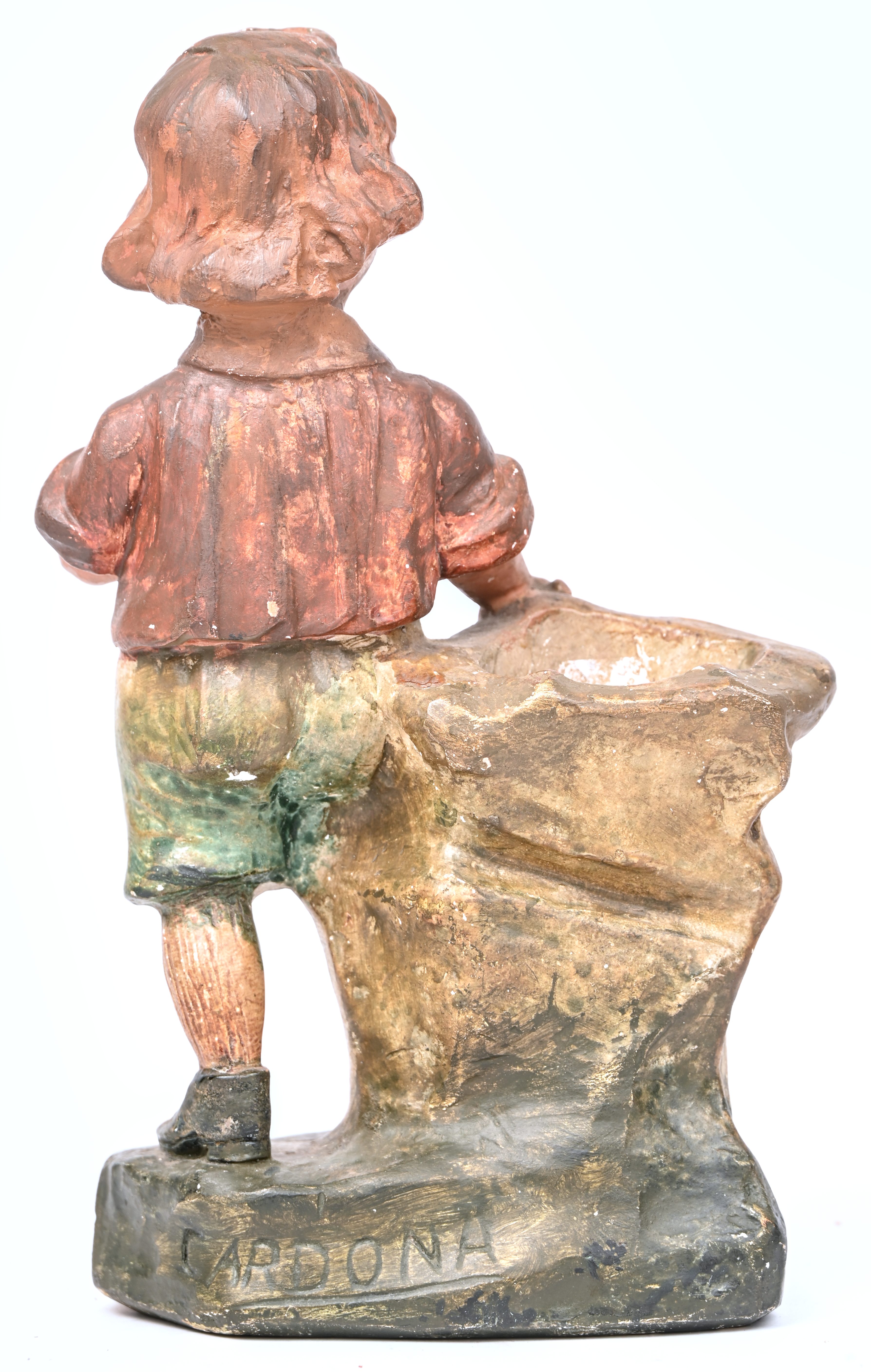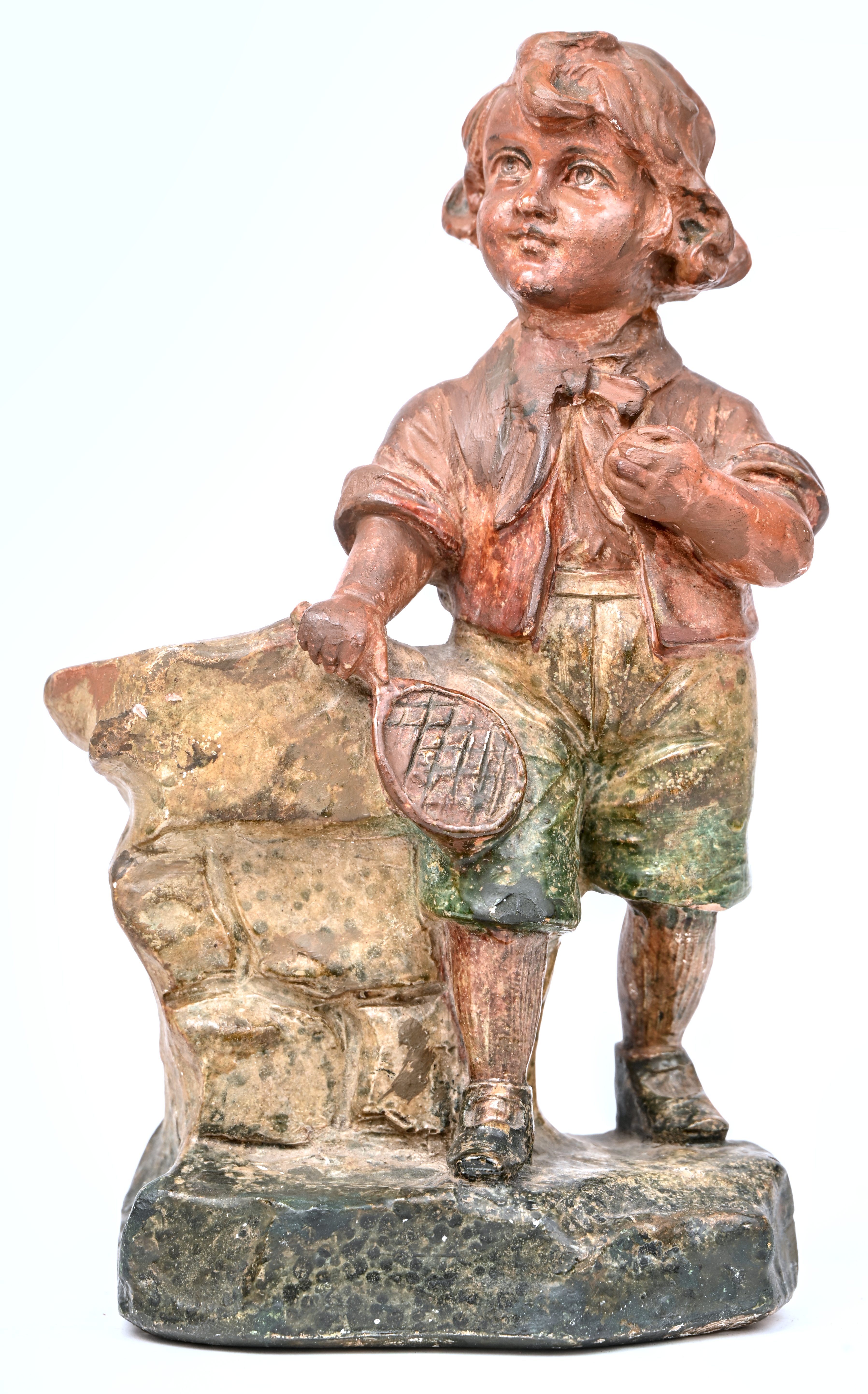 A patinated plaster figurine of a child with a tennis racket.