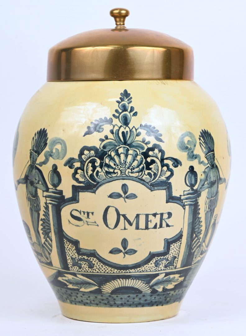 A restored antique tobacco jar inscribed St Omer. Copper lid. Marked on the underside.