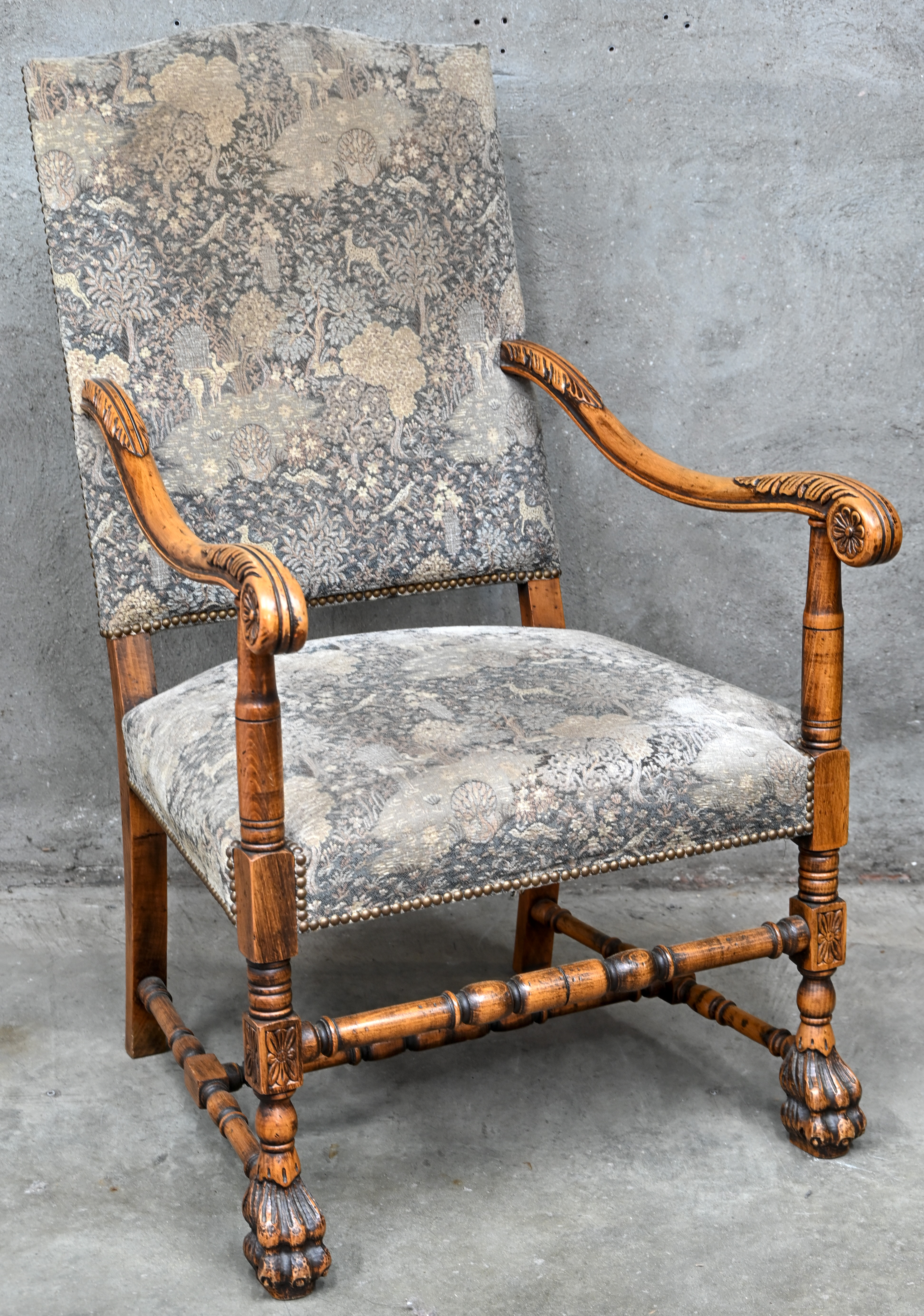 #515Een reproductie van een oud wandtapijt met middeleeuws tafereel.