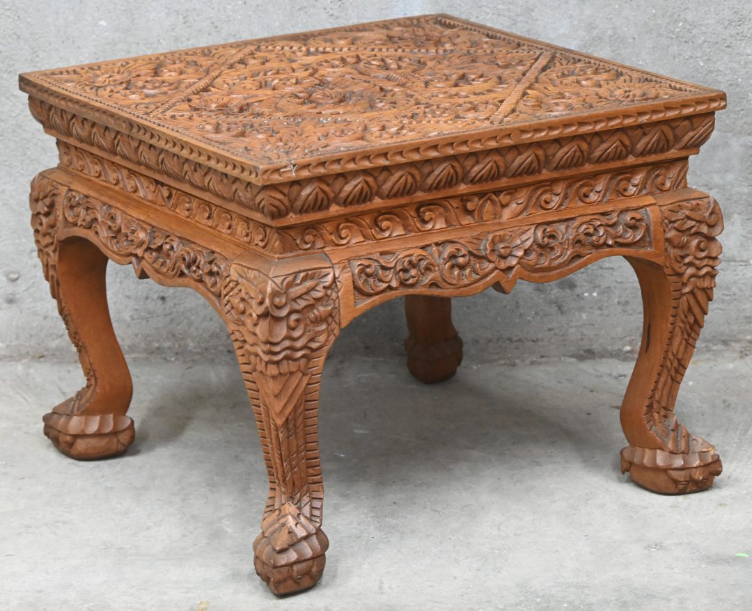 #516Een set van 2 hoge Chinese bijzettafeltjes, gesculpteerd hout met elk 4 draken in het decor.