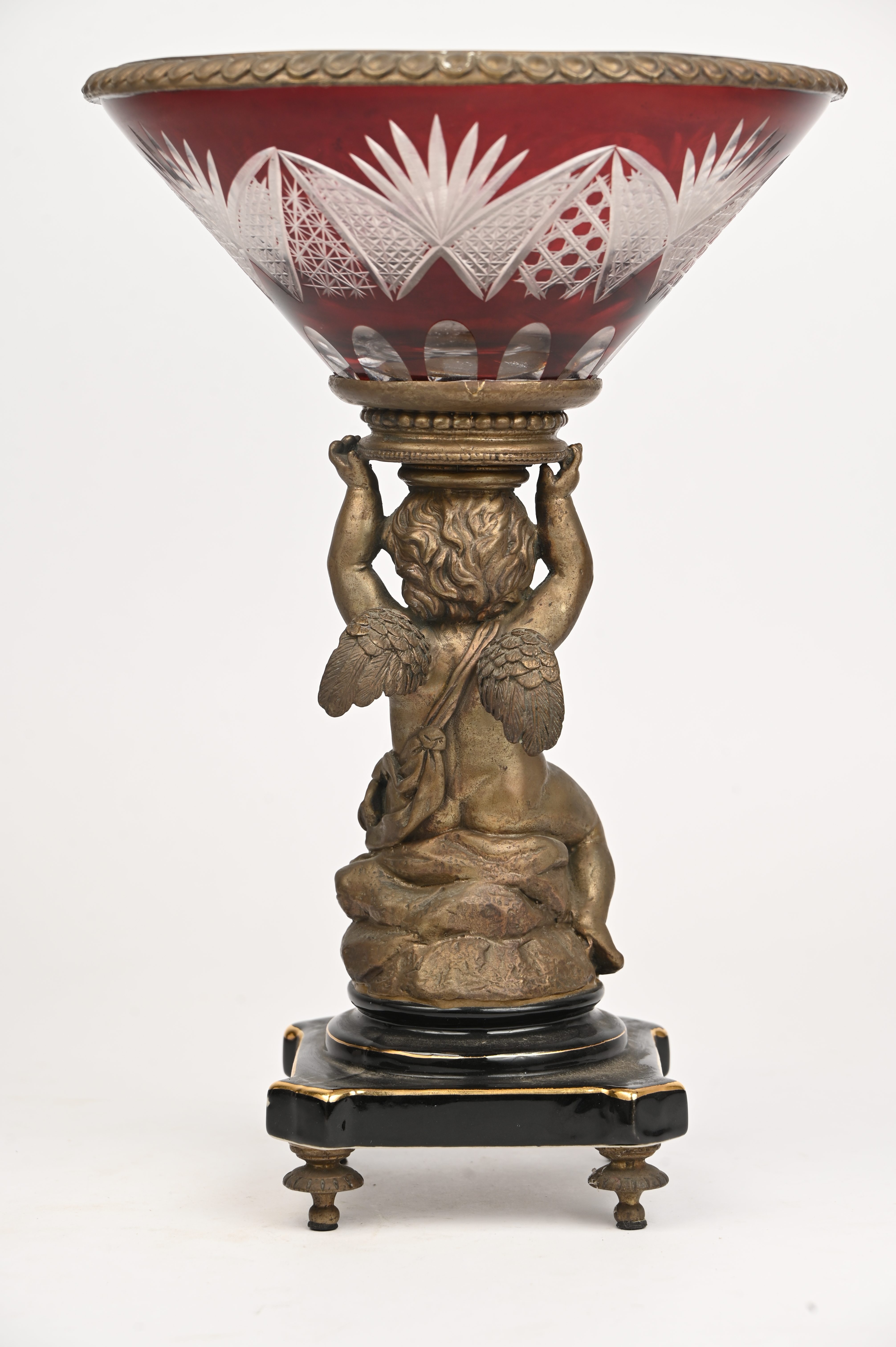 Een geslepen kristallen schaal, gedragen door een bronzen engeltje op porseleinen sokkel. Naar de 19e eeuw.
